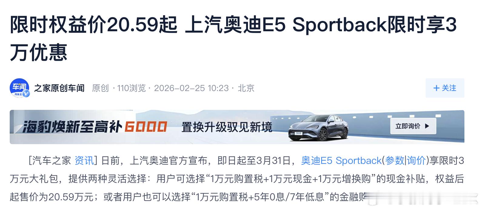 上汽奥迪E5Sportback限时3万现金优惠,顶配落地30万以内