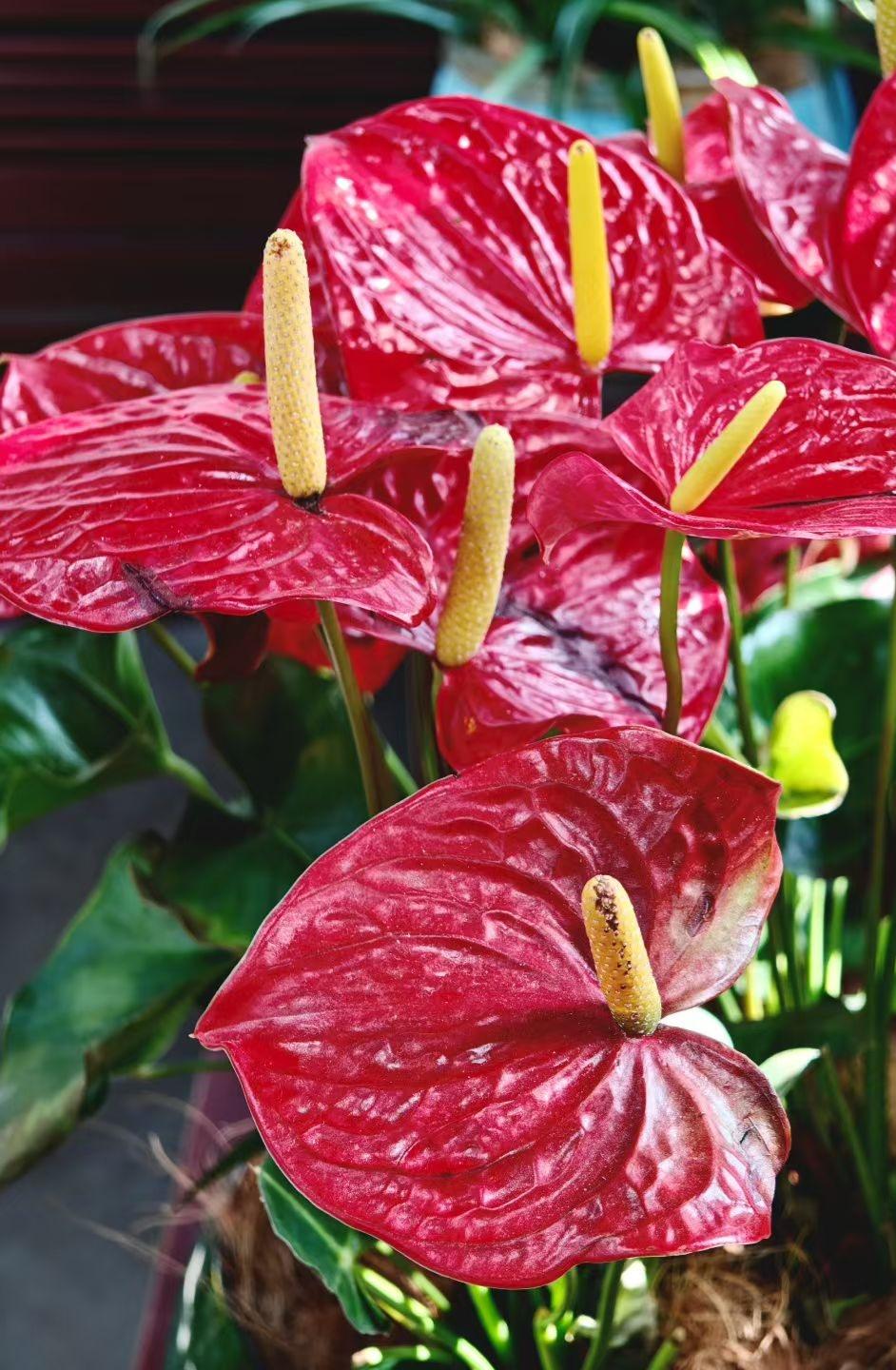 2. 一抹朱红映流年,半盏清欢养心田。花开正盛,福气自来,晚年光景,自在丰盈。 3. 红掌报喜,花开富贵。守着一方绿意,藏着满心欢喜,情绪安稳,便是最好的养生。
