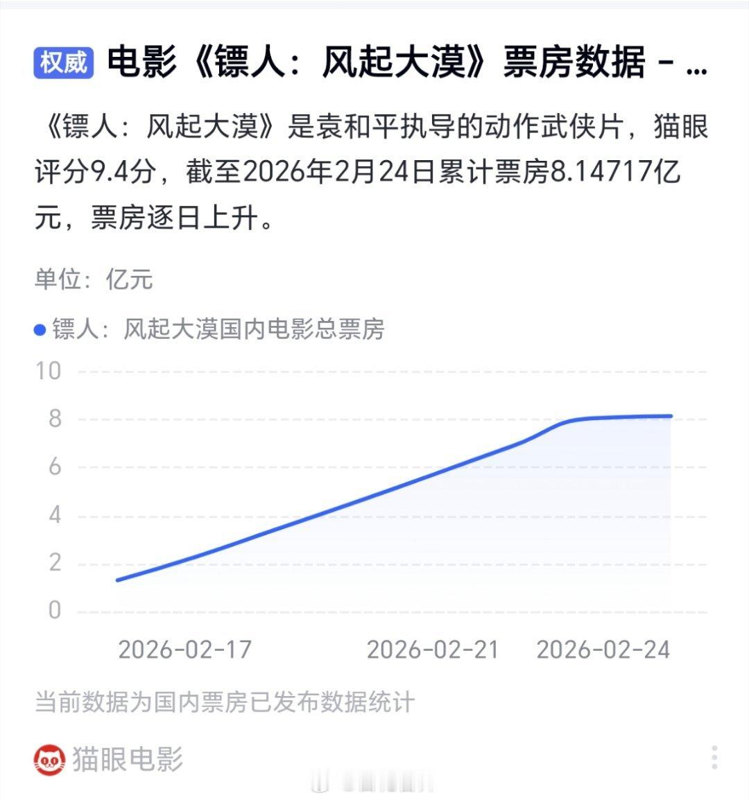 镖人票房镖人票房已破8亿,期待今天破9亿。好片不该被埋没,加油!镖人,风起大漠孤烟直,英雄长河落日圆!