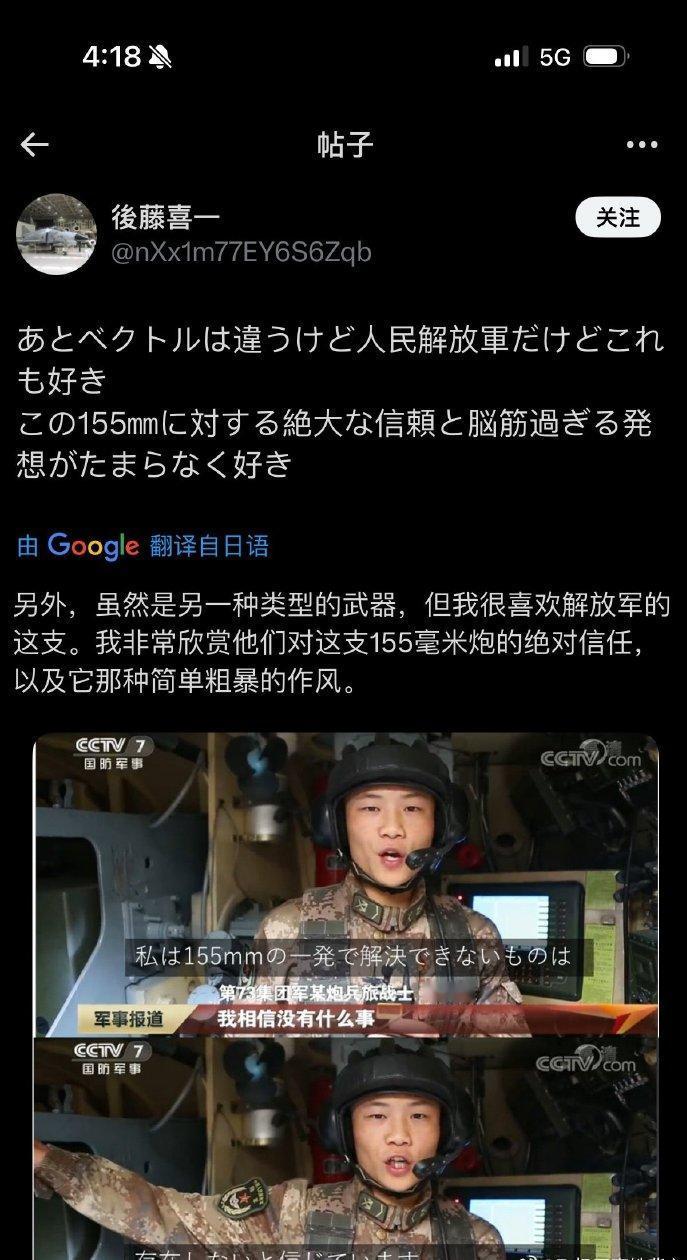 解放军战士在日本推圈爆火,原因竟然是因为一句话! 这位战士面对镜头,没念稿子,也没喊口号,就是用一种特别平常的语气说了一句:“我相信没有什么事情是一发155毫米炮弹解决不了的,如果有,那就再来一发。” 这段视频并非官方刻意发布的宣传素材,只是战士在日常训练间隙,被偶然拍到的随口回应。让人意外的是,爆火的范围不仅限于日本推圈,还扩散到了日本不少社交平台。 有一部分日本网友觉得这句话太过“强硬”,甚至出言质疑,可更多的人却被这份直白又自信的态度打动。 有人直言,比起那些绕弯子的官方话术,他们更喜欢解放军这种不遮不掩、简单直接的作风,还有人感慨,这种从容的底气,绝不是装出来的,背后一定有实打实的实力支撑。 还有日本网友特意去查询了155毫米炮弹的威力,看完相关数据后,更是直言难怪战士能说出这样的话,这份自信有理有据,让人无法反驳。 155毫米炮弹是解放军陆军远程压制火力的核心装备,威力大到超乎想象。 这种炮弹单枚重量就有几十公斤,里面装的炸药能轻松摧毁坚固的野战工事,就算是废弃的车辆,被一发155毫米炮弹击中,也会瞬间被火球吞没,碎片能飞到几十米高空,杀伤范围能覆盖一整个足球场,就算是隐蔽在地下的简易工事,也能被轻松击穿。 而且中国的155毫米火炮技术已经非常成熟,不管是陆军的自行火炮,还是即将装备海军的新型舰炮,在射程、精度和威力上,都处于世界领先水平,射程能轻松突破百公里,精准度更是能控制在几米之内。 最有意思的反差是,就在这位解放军战士因155毫米炮弹的话语爆火时,日本正在费劲心思升级自己的155毫米火炮。 据悉,日本近期正在推进陆上自卫队155毫米火炮的远程化升级,还特意从国外引进技术,试图将火炮射程提升到150公里,可即便投入大量精力,他们的155毫米火炮在威力、精度和稳定性上,和中国的相比仍有不小差距。 更尴尬的是,日本自卫队之前还发生过155毫米炮弹误射事件,训练时因为误装两倍火药,导致炮弹飞进训练场以外的山林,最后出动600多人搜寻,高官还得鞠躬道歉,这样的狼狈,和解放军战士的从容自信形成了鲜明对比。 这段视频传到国内后,也迅速走红,网友们纷纷为这位战士点赞。大家都清楚,战士的这句话,不是狂妄自大,而是对自身实力的绝对信任,更是对国家国防力量的底气所在。 中国军人从不主动挑衅任何人,可也绝不畏惧任何威胁,我们发展国防力量,不是为了称霸,而是为了守护国家的和平与安宁,守护亿万国人的幸福生活。 155毫米炮弹的威力,从来都不是用来炫耀的资本,而是用来抵御外敌、捍卫主权的底气。 这位解放军战士能在日本推圈爆火,本质上不是因为一句话有多“霸气”,而是因为这句话背后的实力,以及中国军人不卑不亢、从容自信的态度。 在这个充满不确定性的时代,这份直白的自信,打破了很多人对中国军人的固有印象,也让更多人看到了中国国防的强大。 比起那些华丽的口号,这种朴素又坚定的表达,更能打动人心,也更有说服力。