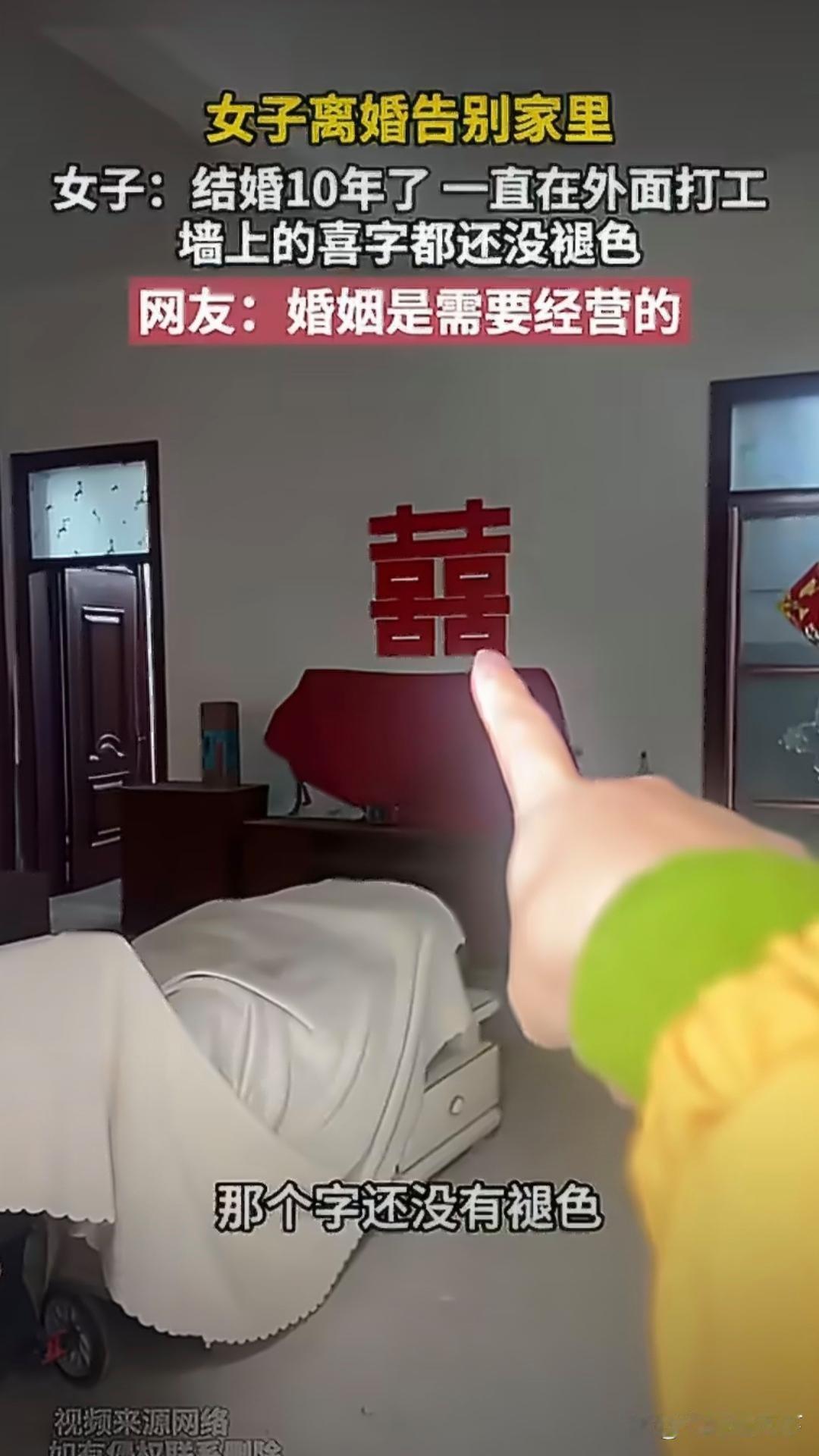 女人拎着行李走出家门,回头看了一眼墙上的‘囍’字。 她说自己打了十年工,字没褪色,婚却离了。 评论区刷屏:婚姻需要经营。 可现实中很多夫妻,一个在外打工,一个在家带娃,一年见一次。 从天天视频,到无话可说。 一位大姐离婚时说,那年过年回家,我看着墙上的‘囍’字,使劲想我老公长什么样。想起来的只有他工服的颜色。 你为了一个家拼命分开。 最后却把家拆了。 婚姻不是靠一句轻飘飘的“经营”就能维持的。它需要两个人能待在一起。需要看得见脸,听得见呼吸,吵得动架。需要早上谁先抢厕所,晚上谁去关灯。需要这些琐碎的、具体的、伸手就能碰到的温度。 而不是隔着屏幕的问候,和一年只见几天的客气。 墙上那个‘囍’字红得刺眼。它像个沉默的证人,看着这个家从两个人变成一个人,再变成空房子。它不会褪色,因为它不用经历分离。而人会。 十年打工挣来的钱,可能够付一套房子的首付。可十年分离耗干的感情,再也买不回来一张全家福。 你拼命想给他和孩子更好的生活。 你拼命到忘了生活本身是什么样子。