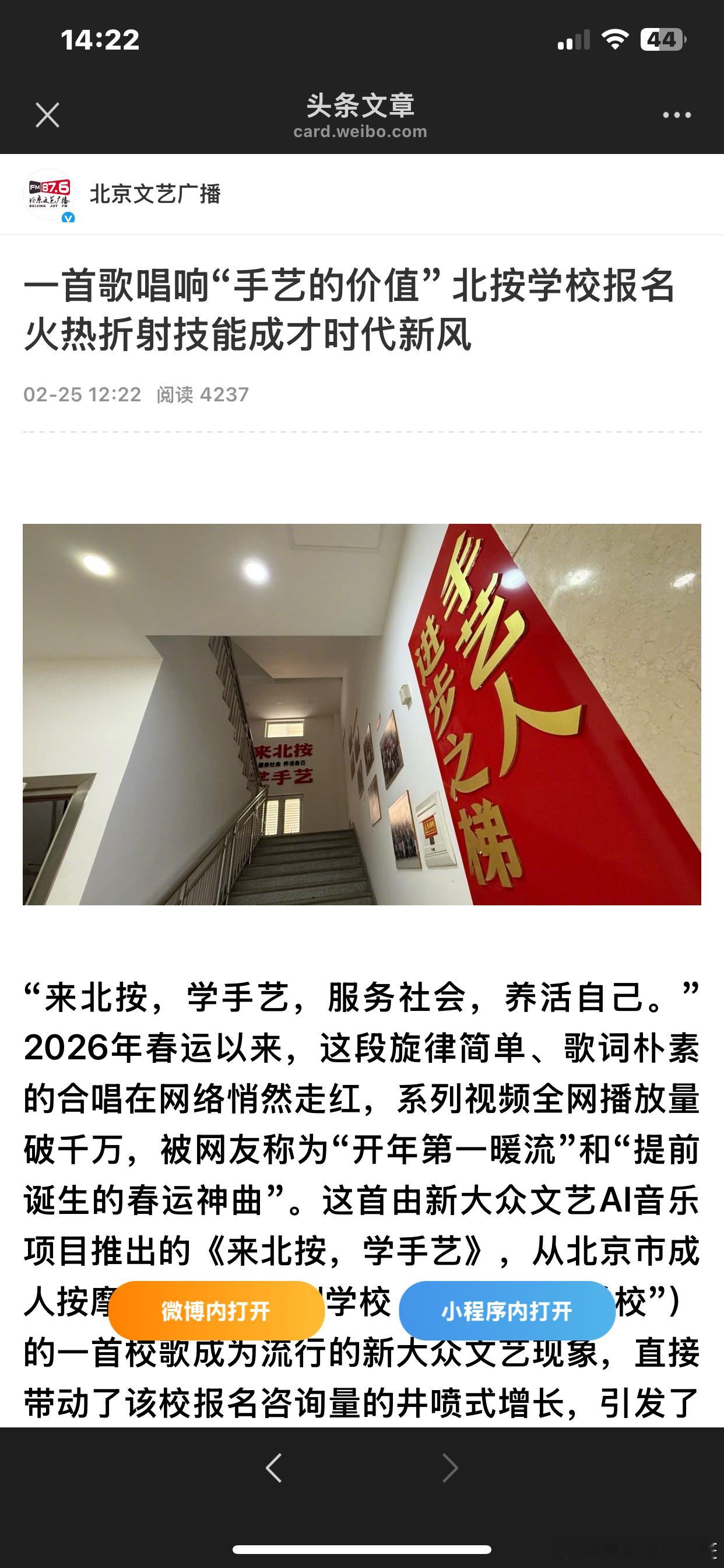 来北按学手艺太火了北按学校报名火爆一首朴素的校歌意外走红全网,播放量破千万还带火了北按学校的报名咨询,这股热潮背后,藏着大众对技能成才最真切的认同。手艺从不是简单的谋生手段,而是普通人靠双手安身立命、收获尊严的底气,更是技能就业、增收成才的鲜活载体。这首歌的出圈,也恰恰印证了多元成才路径被看见、被尊重时,能激发出多么强大的社会共鸣,让技能照亮更多人的前行路,这才是最动人的时代暖流。