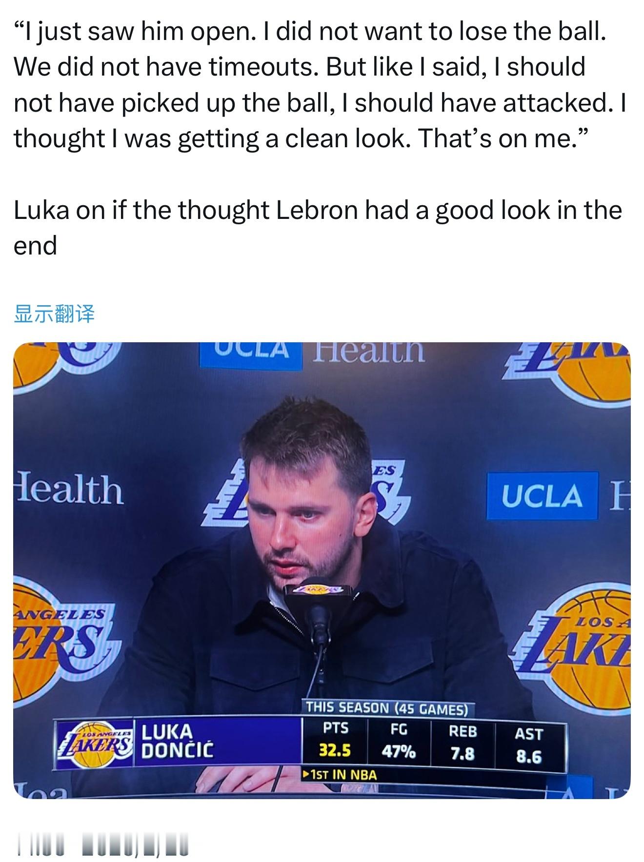 东契奇被问到是否认为詹姆斯最后有好的投篮机会:“我当时就是看到他处于空位。我不想失误,而且我们也没有暂停了。但就像我说的,我不该停球,应该直接突破。我以为自己能获得一个干净的出手机会。这责任在我。”