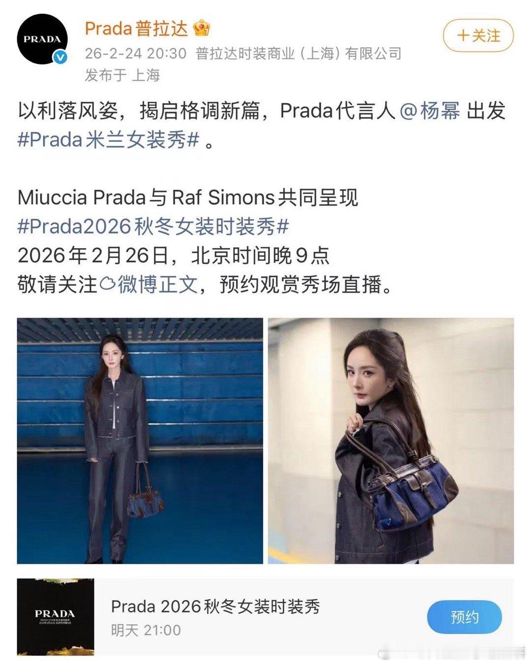 Prada代言人杨幂 杨幂出发时装周的造型来了!开工大吉,一身工装牛仔装造型誓要今年拉我买牛仔外套了嘛!利落简约,配得上幂姐“飒惯了”的气场啊哈,期待解锁杨幂米兰时装周的更多造型!