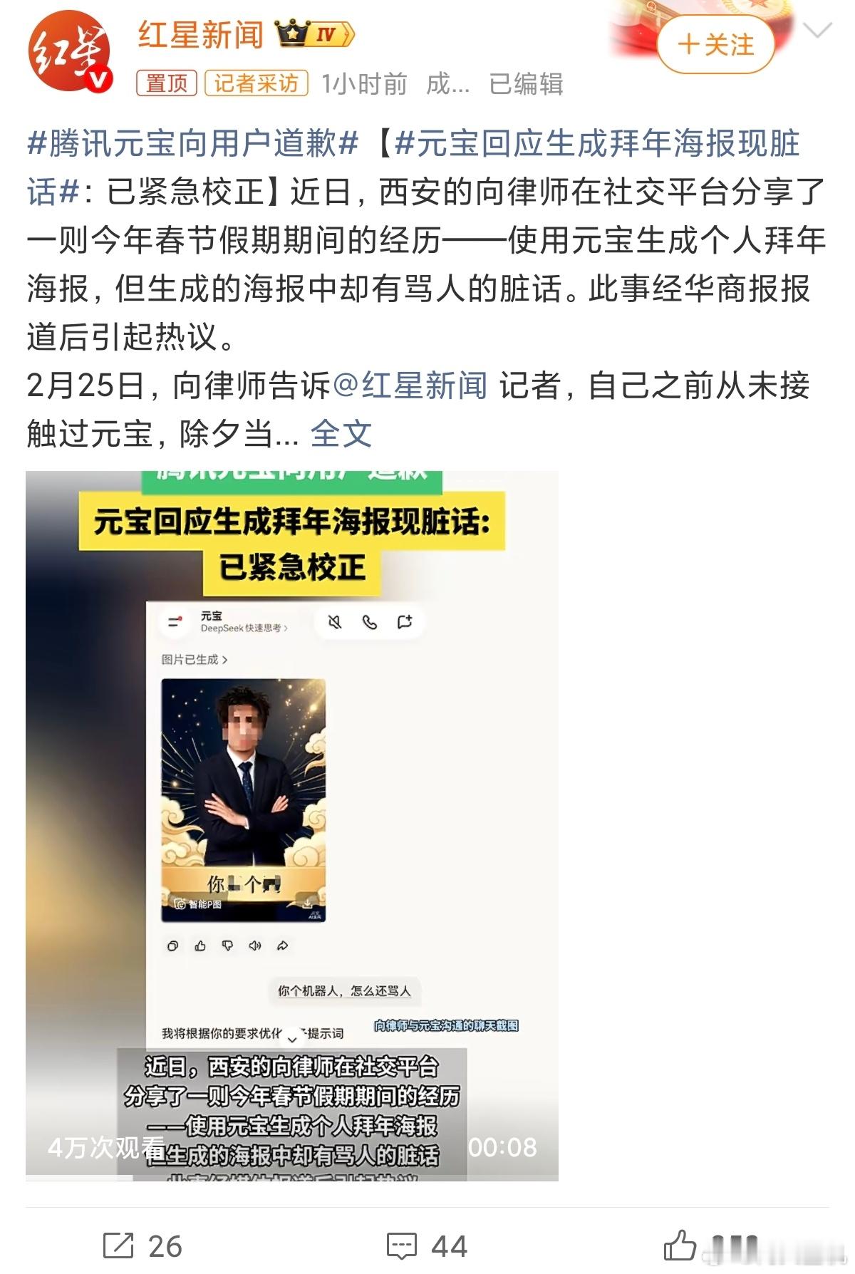 腾讯元宝向用户道歉这才是真正的商站,元宝生成的拜年海报里面有骂人的话,这应该已经超出了最初的ai设定,看来大模型开始像人类一样推演了,有点恐怖,模拟有人类意识的行为,未来ai我们真的能控制的住吗?突然想起一些科幻片,未来机器人有自主意识会不会取代人类?