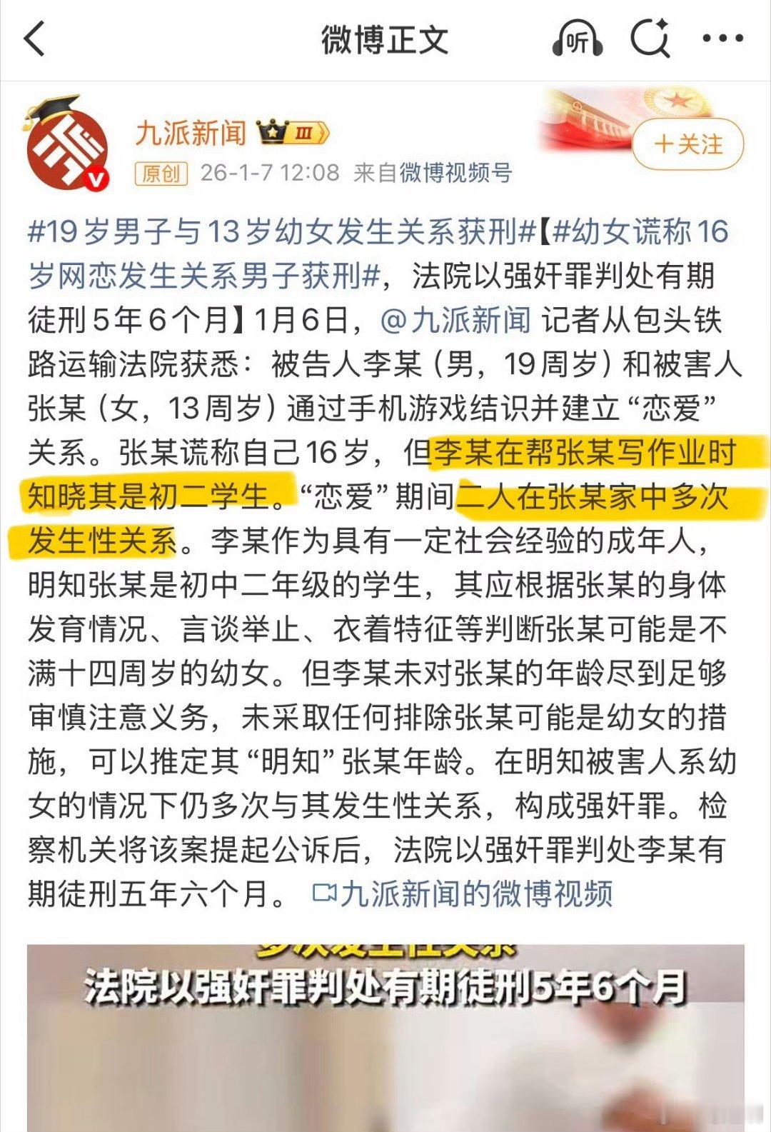 2026年1月7日,媒体报道称包头铁路法院审理了“19岁男孩与13岁女孩发生性关系的强奸案。