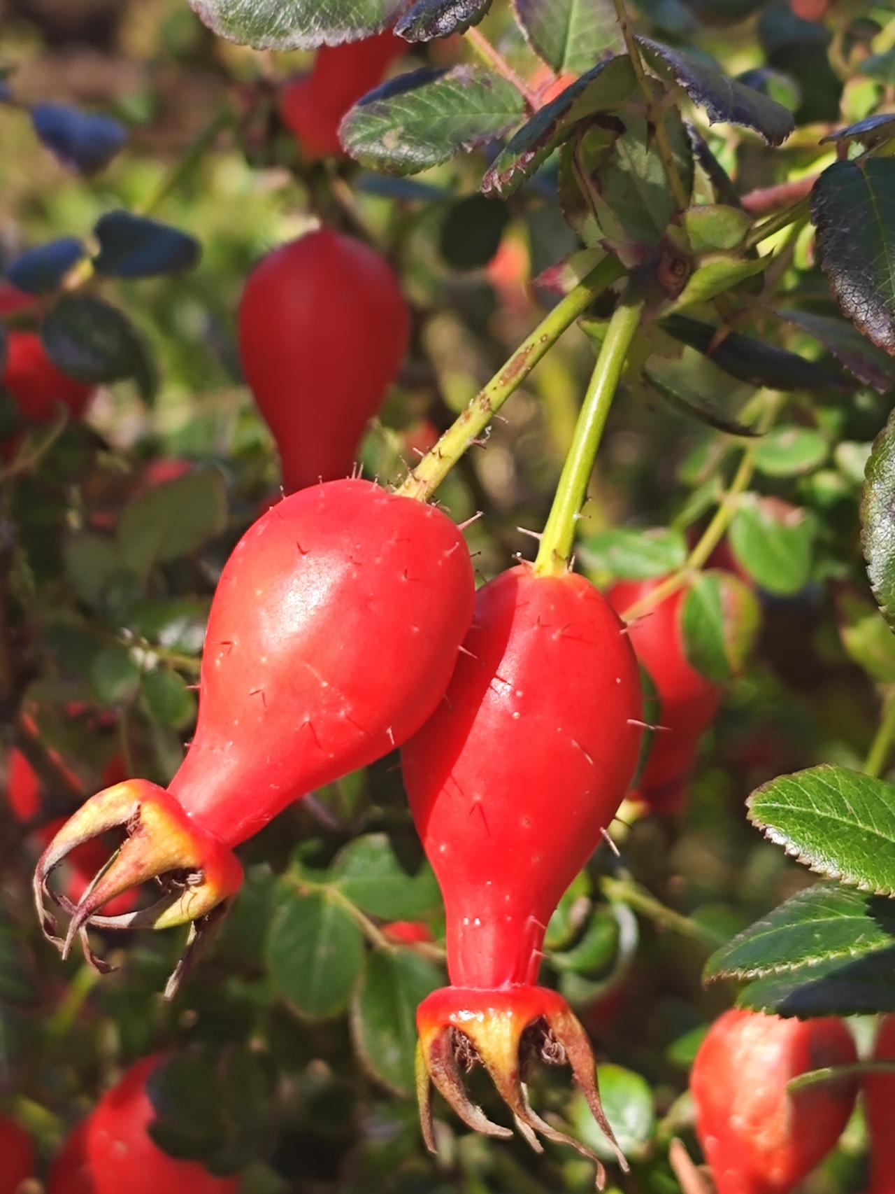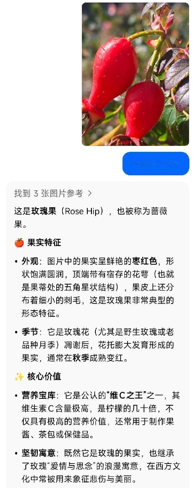 玫瑰果你见过吗? 在但尼丁火车站旁的路边,拍到了一种红色小瓶状的果实,首次看见,甚为惊奇,随即拍下了问问豆包,豆包的回答让我吃惊,这居然是“玫瑰果”! 我们都知道玫瑰花是爱情的象征,是情人节的礼物,可对于玫瑰果还真是第一次见到哈,不但形状奇特,颜色鲜红,而且还是公认的维C之王。 说实话,一直以来,对于玫瑰与月季的区别,始终没有弄清楚。记得原来在百度上询问过,好像说玫瑰与月季在英文里没有区别,百度说二者在英语里都是一个单词rosa。而豆包观点还是很明确的,二者虽然都属于蔷薇科蔷薇属,但还是有很大区别的。 玫瑰花形小,叶片皱,皮刺小而密集,花期集中,一年一次,香气浓郁醇厚,可以提炼精油、制作花茶、玫瑰酱等。 月季花形有大有小,叶片光滑油亮,皮刺粗大而稀疏,花期时间长,几乎月月都开花,香气清淡,花色丰富。所以说我们平时买的玫瑰花,大多数是月季花。[捂脸] 这样的玫瑰果你见过吗?