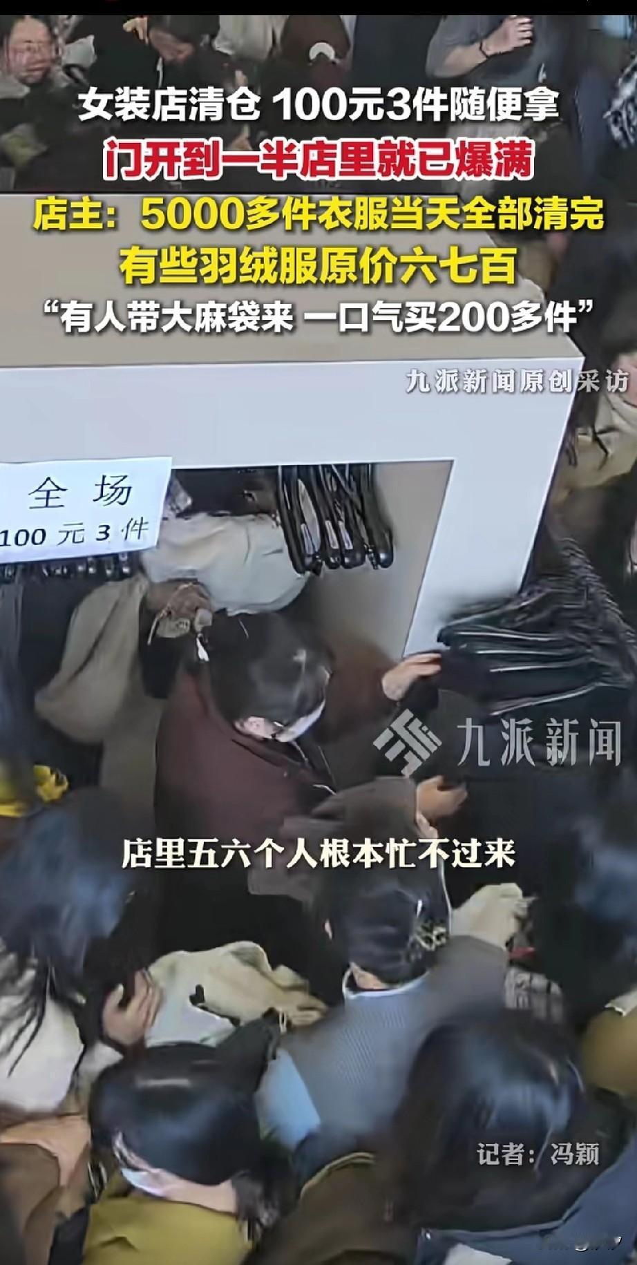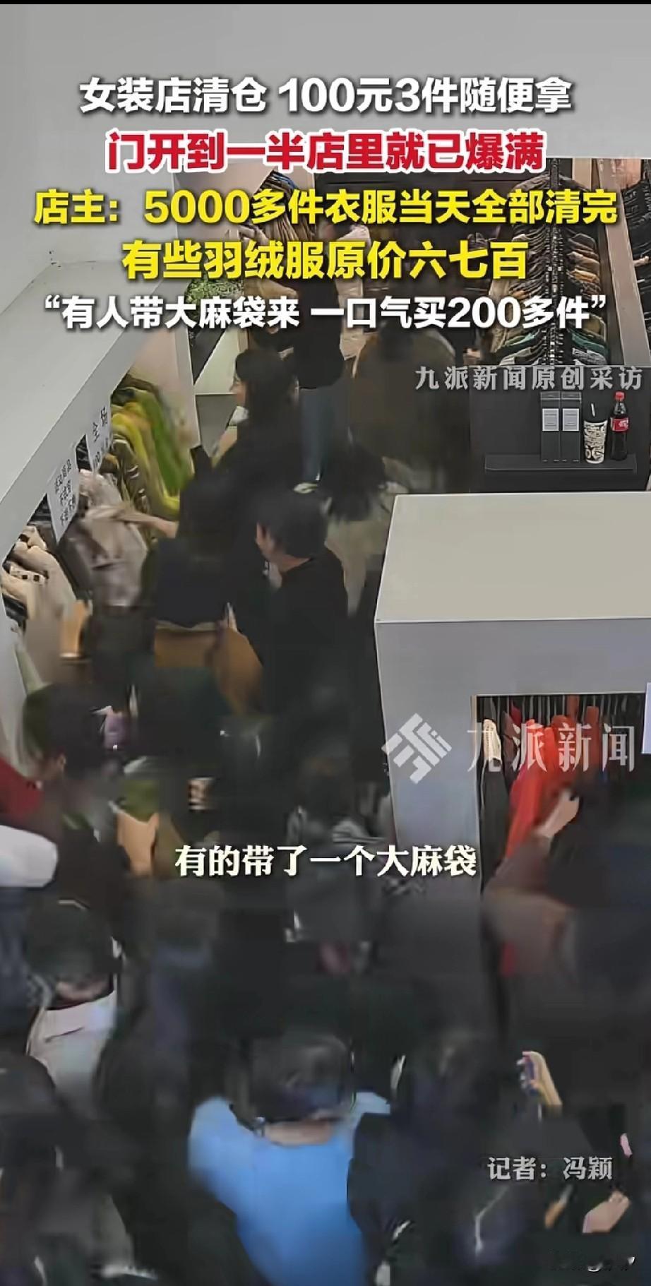 广东一家羽绒服店清仓, 100块钱三件随便拿, 店主都被现场的人流惊呆, 没有想到有这么多人, 门开了一半,就有无数的人冲了进来, 他们有的人拿着麻袋, 看到喜欢的就直接往里装, 这些羽绒服平时都卖五六百一件, 现场5000件羽绒服, 不到一天的时间直接清空了。 她说老顾客都知道, 每年都有两次搞活动的时间, 她叫来了全家的亲戚, 全家亲戚都出动,也忙不过来, 也不怕有人偷衣服, 就当白送了, 做生意就是要赚个人气, 这样薄利多销也非常的赚钱, 大家有遇到过这样的清仓活动吗?