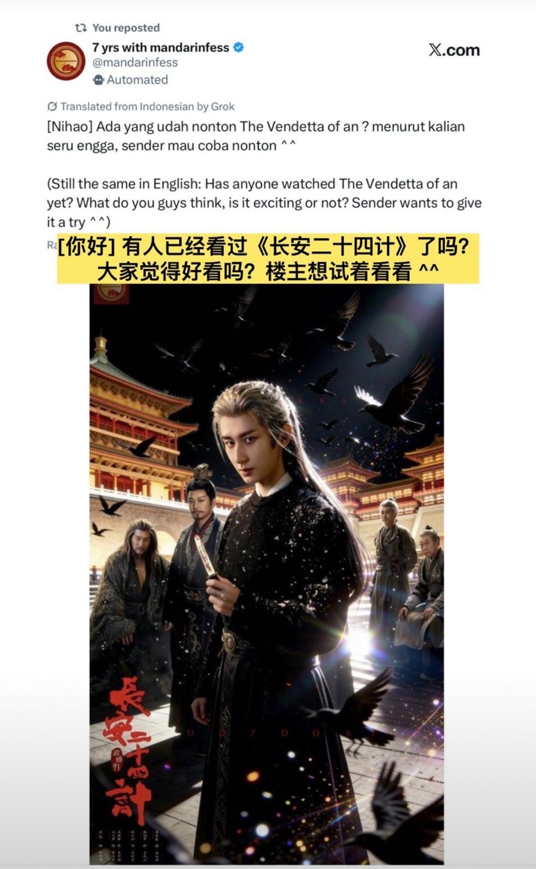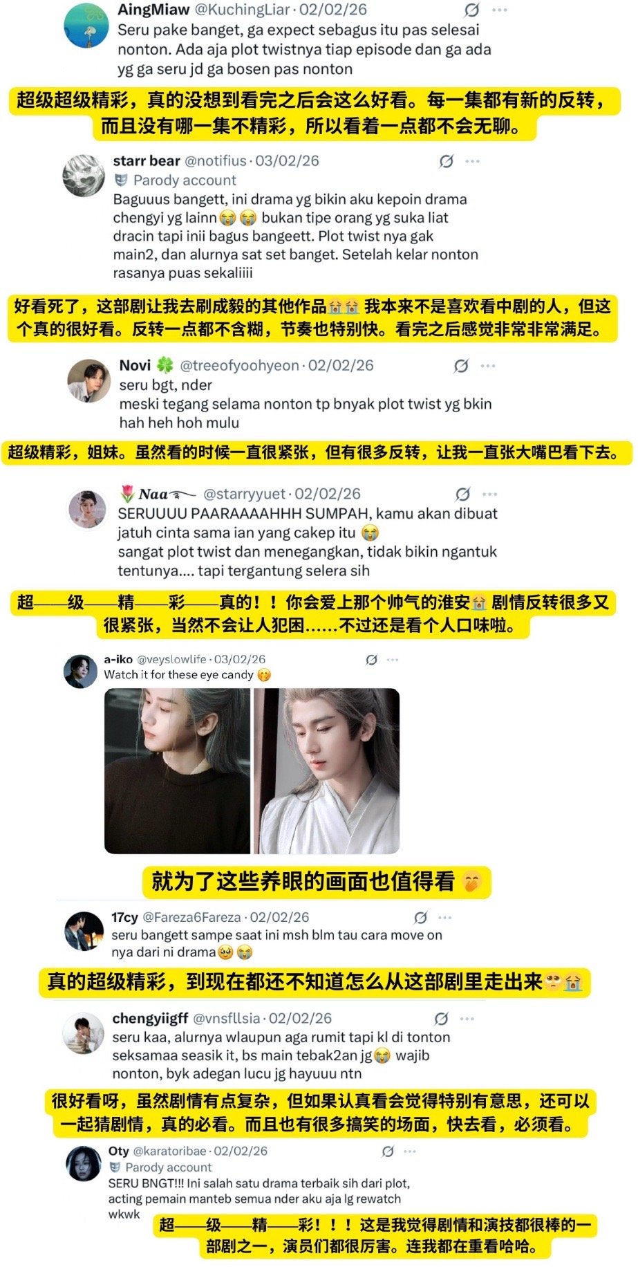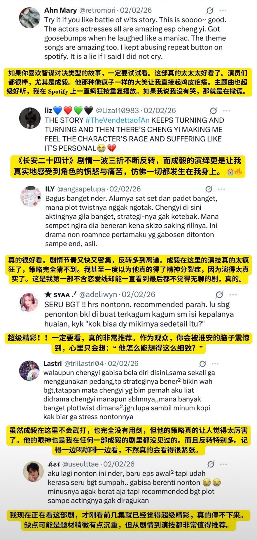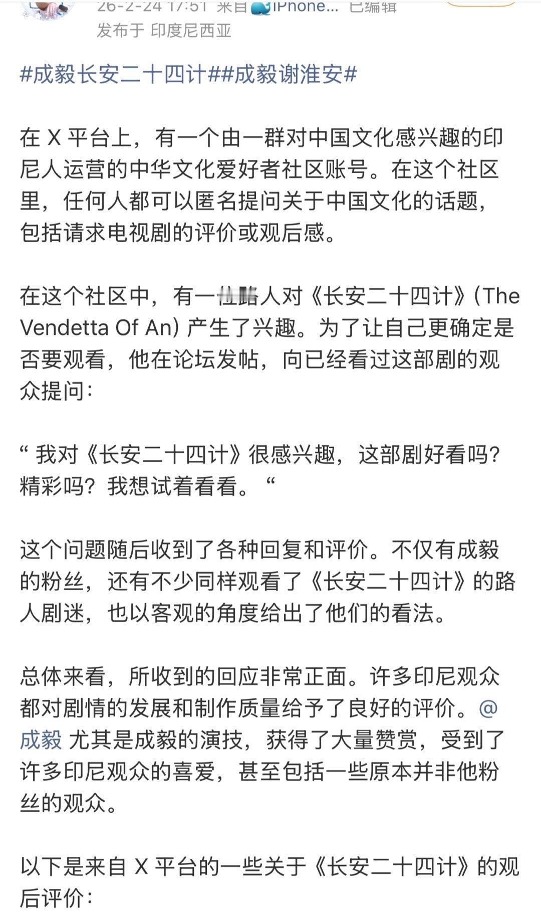 成毅长安二十四计在X平台上获得了许多印尼观众的夸赞。都在夸剧情和成毅的演技,好作品好演员向全世界传播中国文化!🔥