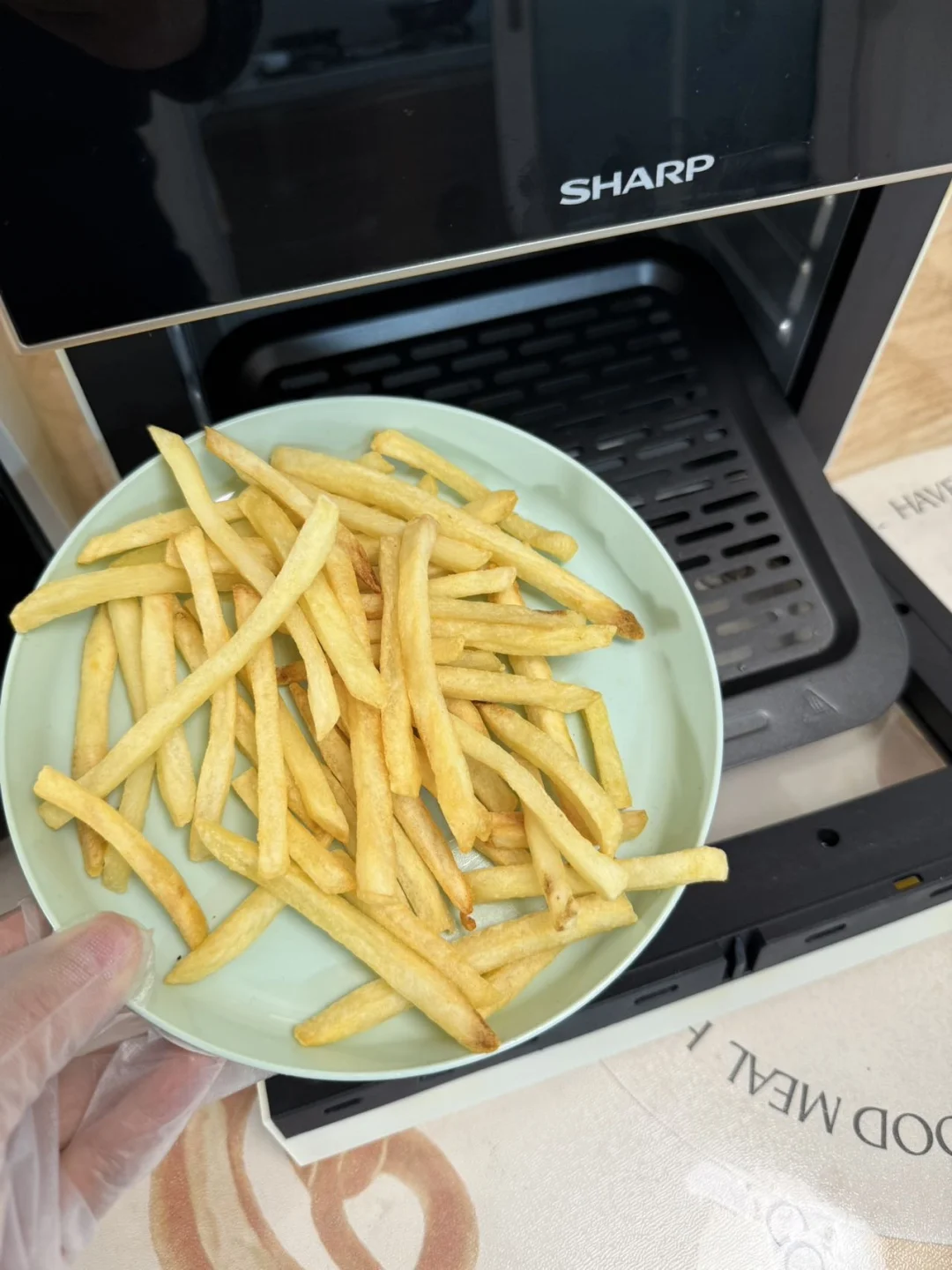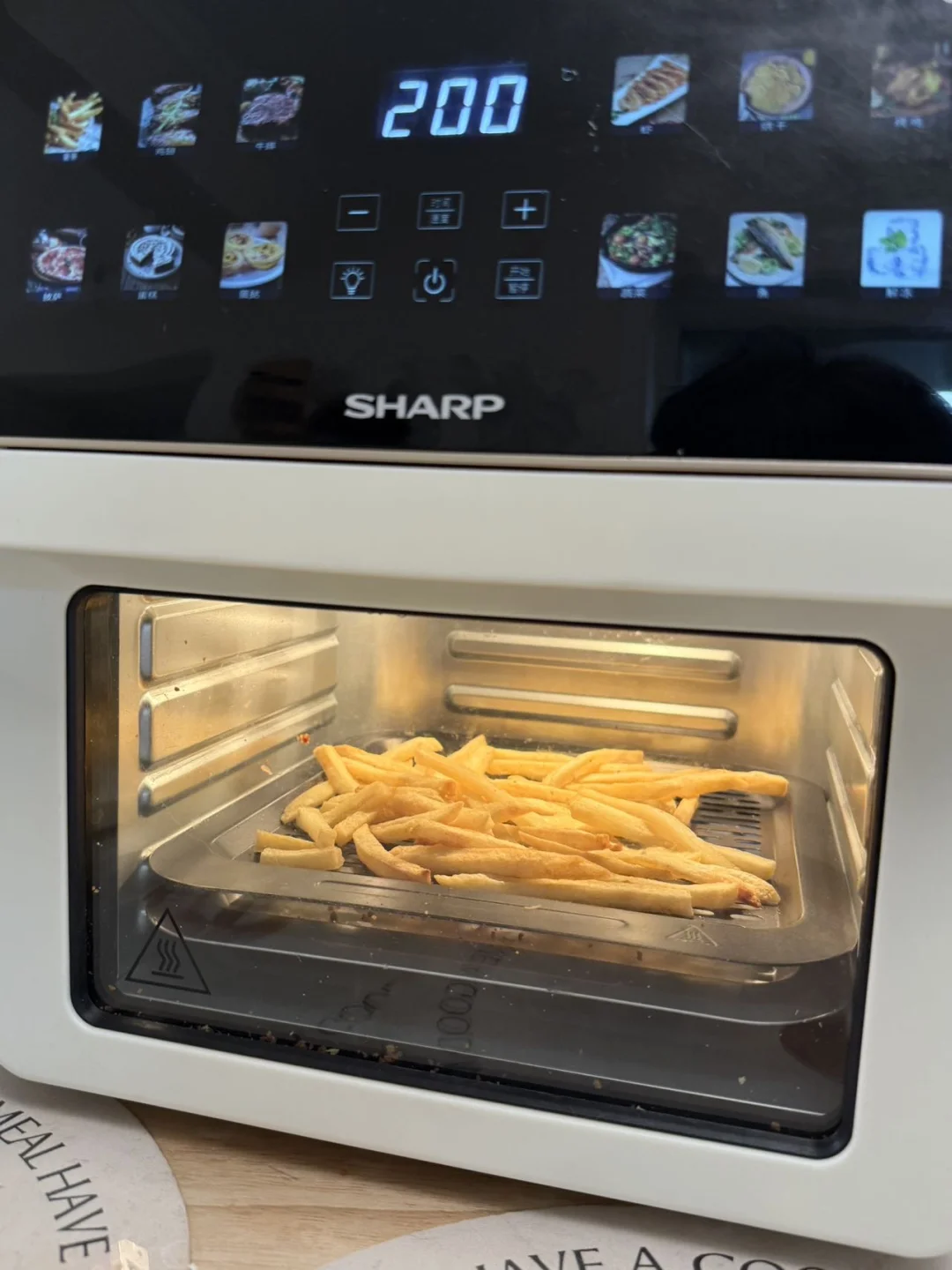 ✌️第二个是之前觉得单一个炸锅吃来吃去有点单调,想每天给自己换点口味,就入了这种炸锅烤箱一体的夏普空气炸锅。😋今天随手点了个薯条模式烤了点薯条,没额外放盐,晚上本来也不想吃太油的,200度20分钟,这个吃着刚好,也不会干巴巴的。受热均匀和肯爷爷的大差不差,好感度upup⬆️