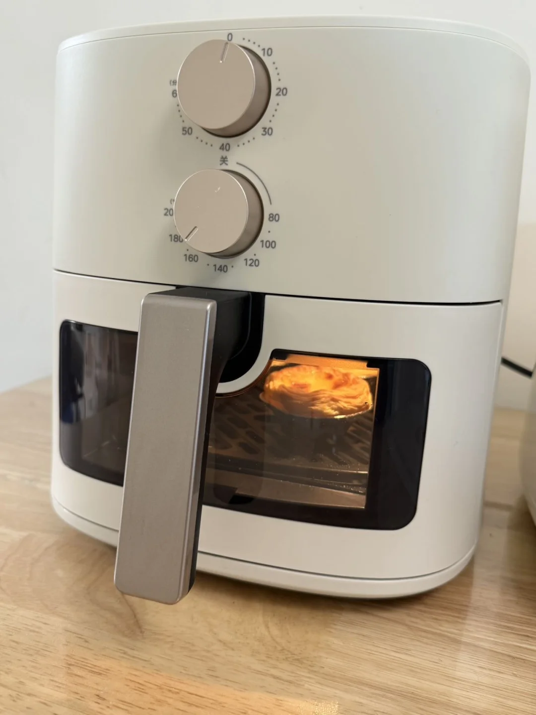 ☝️第一个按钮的抽拉款,就按机身上标的时间,直接打了 10 分钟。我老是对不准那些小刻度,干脆就统一用 10 分钟、20 分钟这种整数来。放了四个蛋挞进去,早上刷牙那会儿我还特意走过来给它们挪了挪位置,又多闷了几分钟,吃起来皮有点韧韧的,就是我自己操作出来的那种状态。