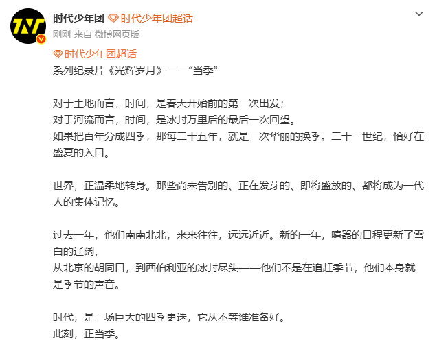 时代少年团当季 时代少年团此刻正当季 时代少年团此刻正当季,时代少年团纪录片光辉岁月当季篇来啦,谁懂小炸们从北京到国外,满分惬意的旅行,这次一起回顾属于他们的故事啦~