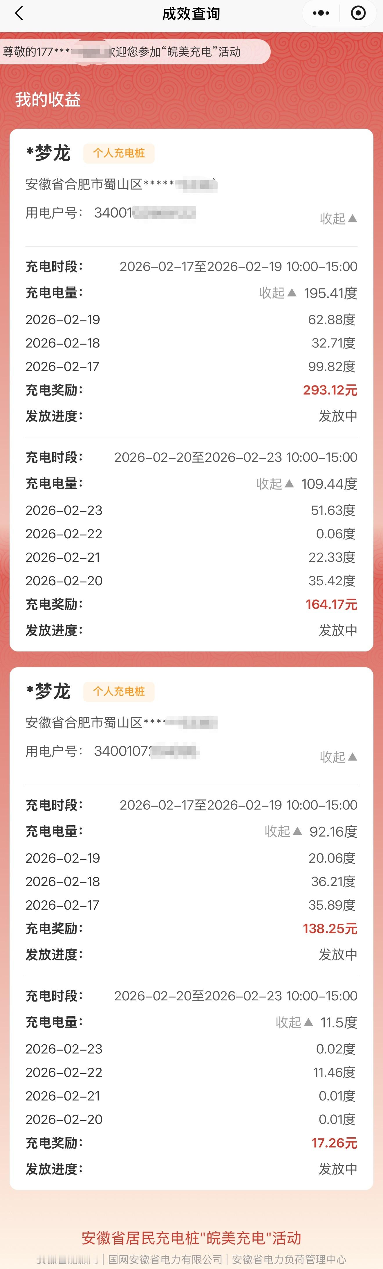 保电网,护民生,2月17日(年初一)至2月23日(年初七)共计帮助国家电网消耗408.51度电[机智]获得奖励612.8元,除去电费251.37元,羊毛金额361.43元皖美充电,国网安徽牛逼!20kW直流家充桩立大功。 合肥