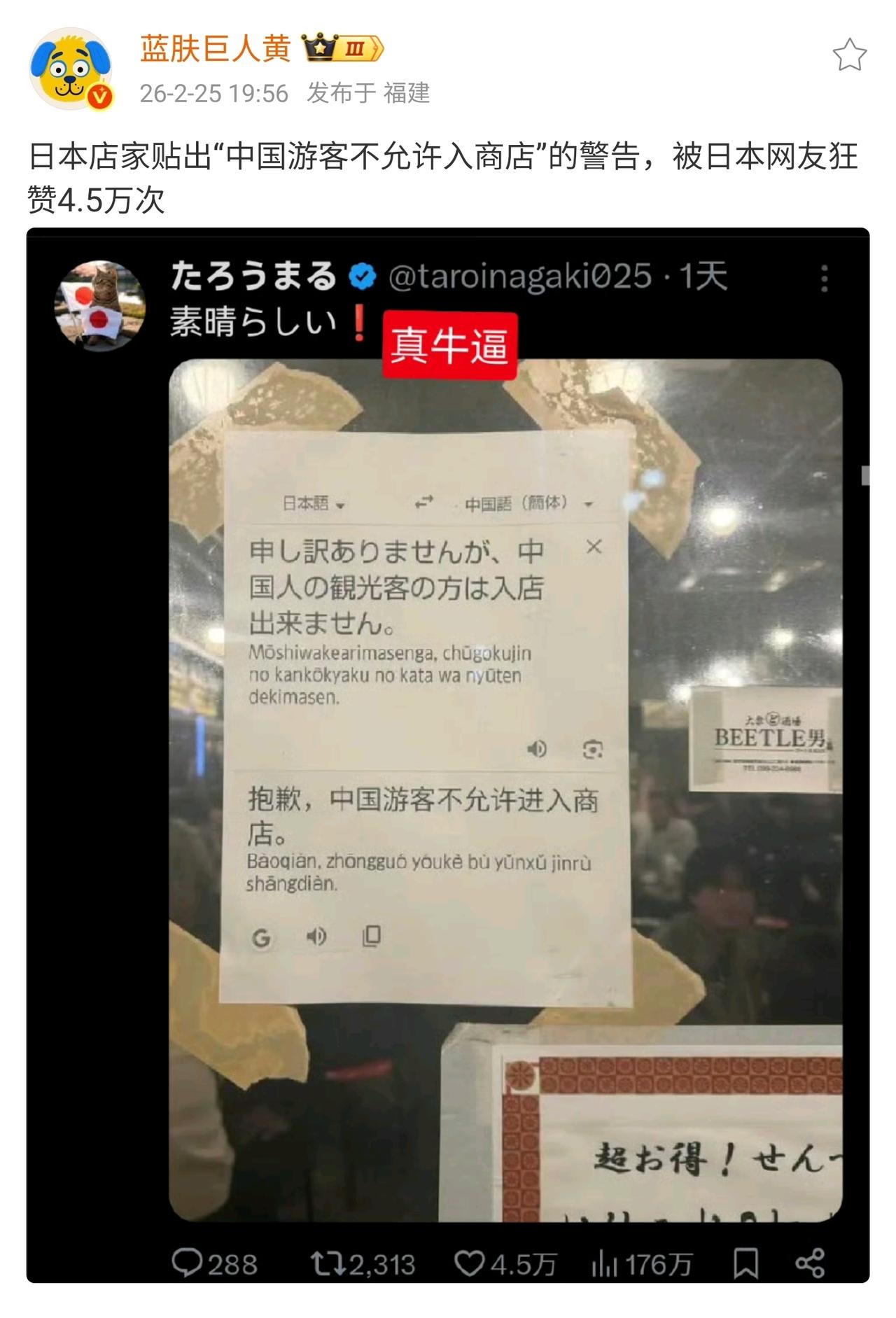 被这张图气到浑身发抖。 日本一家商店直接贴出中日双语告示,明明白白写着“抱歉,中国游客不允许进入商店”。 更离谱的是,这条帖子在日本社交平台被狂赞4.5万次,还有人直接喊“真牛”! 合着我们花钱去旅游,就是为了看这种明晃晃的歧视? 之前各种双标对待、阴阳怪气也就算了,现在连遮羞布都直接扯掉了? 我就想问一句:这地方,真的非去不可吗? 国内的大好河山不够看吗? 从雪山到大海,从古城到水乡,哪一处不比这里香?就算出国,东南亚的热情、欧洲的包容,哪一个不比这里让人舒服? 别再拿“旅游无国界”自我感动了,当别人把“不欢迎你”贴在脸上时,再上赶着去,那不是旅游,是送脸给人打! 谁爱去谁去,反正我是不会再去了!