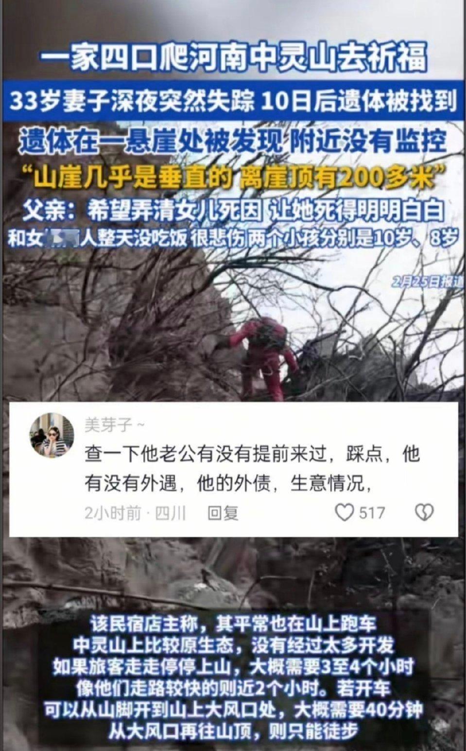 一家4口上山妻子死亡失联时神情恐惧一家四口登山却出现妻子死亡、失联者神情恐惧的情况,事件逻辑上存在诸多不合理之处。公众关注的不只是猎奇,更是对真相和生命的重视。在官方通报出来前,不宜随意猜测或传播未经证实的信息。等待权威调查结果,既是对逝者尊重,也是对事实负责。愿悲剧不再重演,出行安全永远放在第一位。
