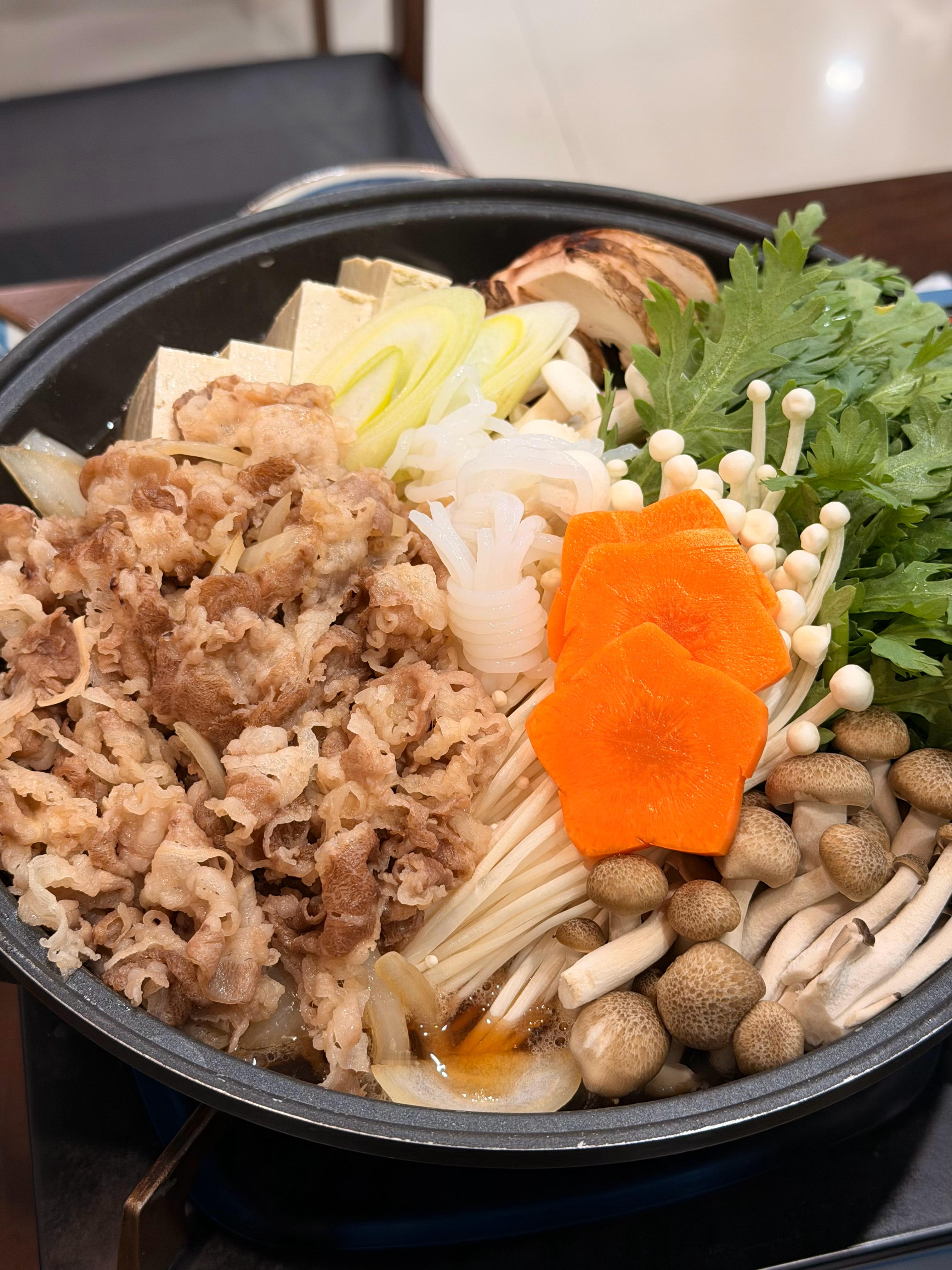 修完脚吃点清淡的,第一次吃寿喜锅,要用牛肉卷蘸生鸡蛋液搅拌吃,有点意思