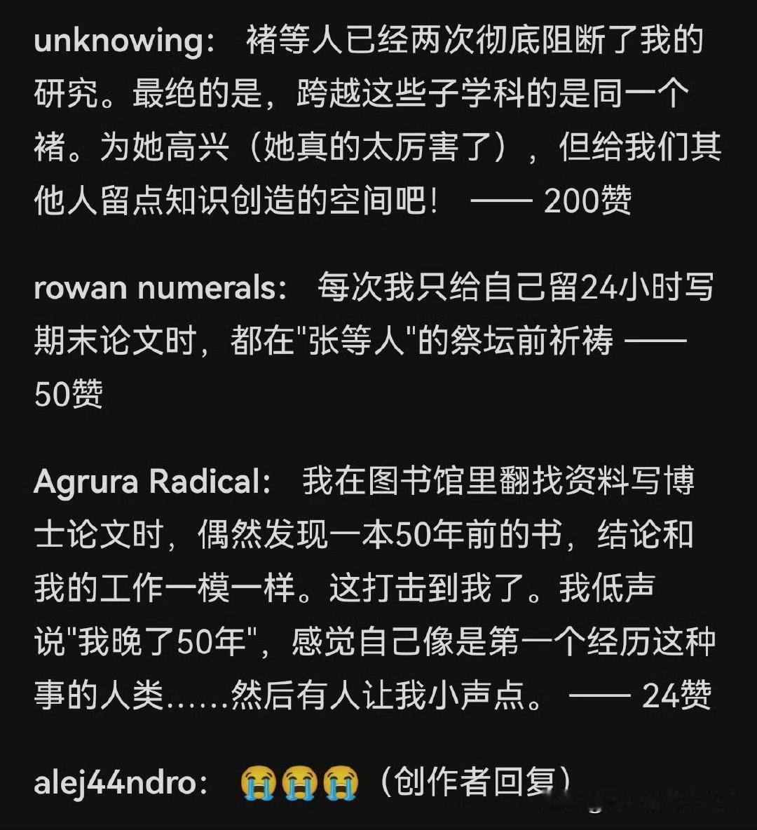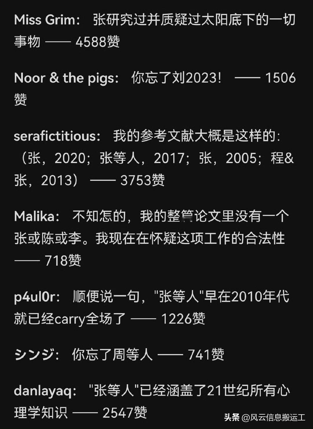 现在在老外眼里,中国人简直是学术界的克苏鲁 更搞笑的是,因为中国作者在引用文献的英文名基本上都是姓的拼音,而张又是中国的大姓,导致很多老外“惊恐发现”研究人员“张”把所有的领域都给研究完了,而且发表的全是学术前沿的论文