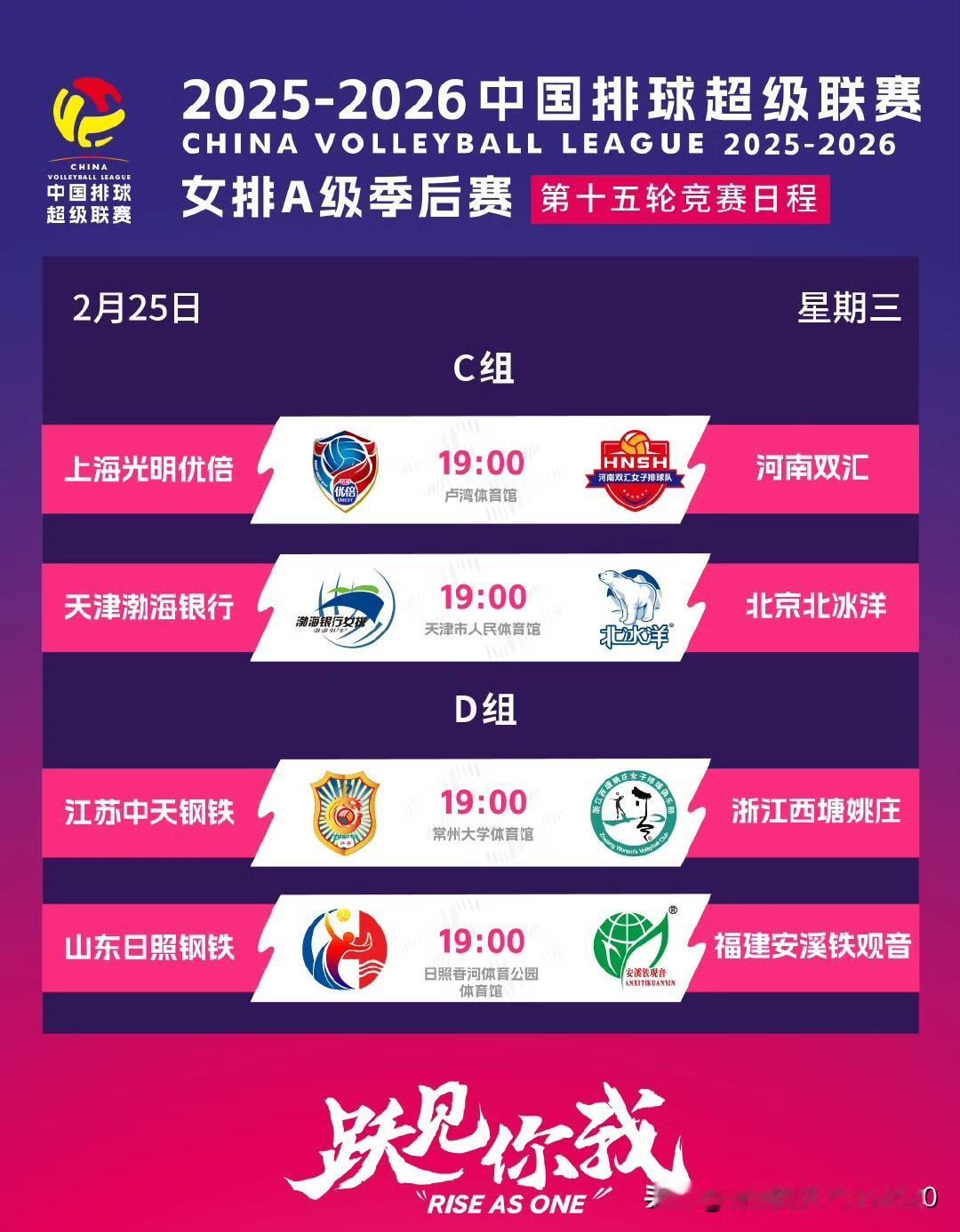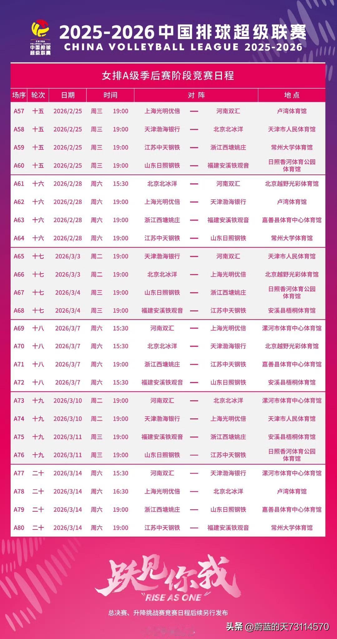 [玫瑰][玫瑰][玫瑰]引球迷关注的女排A级季后赛今(25日)19时同时拉开战幕,共有C组和D组的各两场比赛。首轮战报如下: —,C组(上海、天津、北京和河南女排): 1,上海光明优倍首战告捷以3-0战胜河南双汇,开门红,局比分:25-18,25-14,25-21。 2,天津渤海银行首战告负以2-3不敌北京北冰洋,北京女排旗开得胜,五局比分为:25-11,23-25,25-21,21-25,10-15。 二,D组(江苏、山东、福建和浙江女排): 1,江苏中天钢铁先声夺人,以3-0战胜浙江西塘.姚庄,局比分:25-14,25-20,25-7。 2,山东日照钢铁先拔头筹,3-0击败福建安溪铁观音,局比分为:25-21,25-19,25-17。 三, 女排A级季后赛各队实行组内双循环,各有六场比赛(3主3客),获小组前两名的队晋级四强,打交叉半决赛,获小组后两名的队进入5~8名的排位赛。 四,女排A级季后赛赛第二轮(28日)对阵情况(详见截图二): C组:北京-河南,上海-天津。 D组:浙江-福建,江苏-山东。