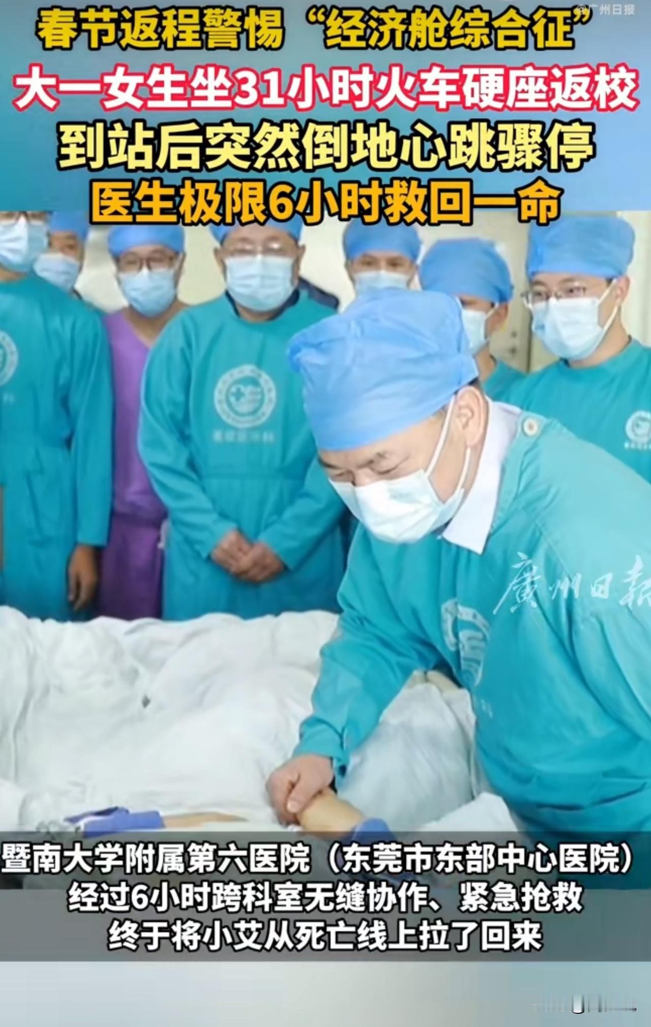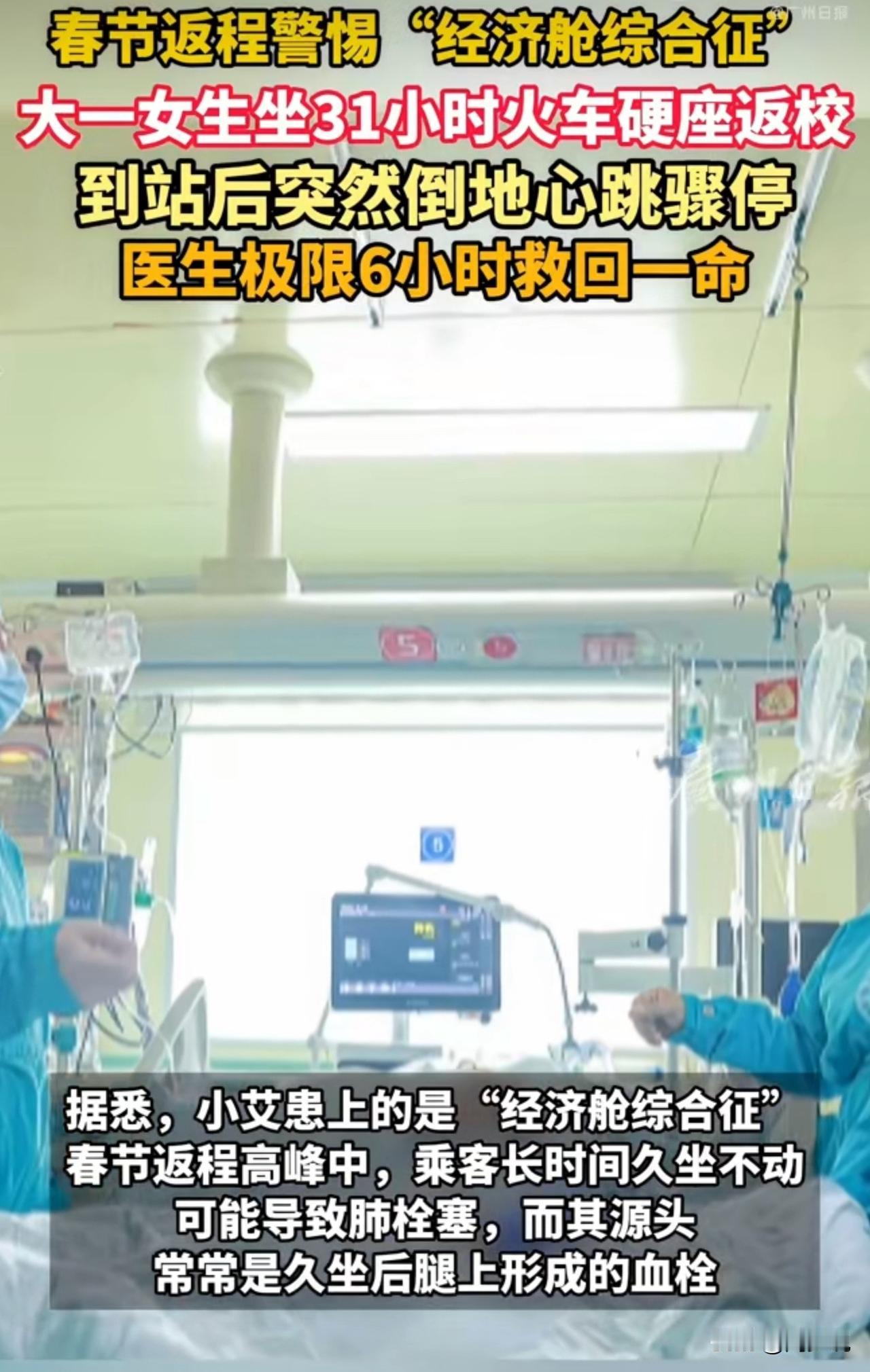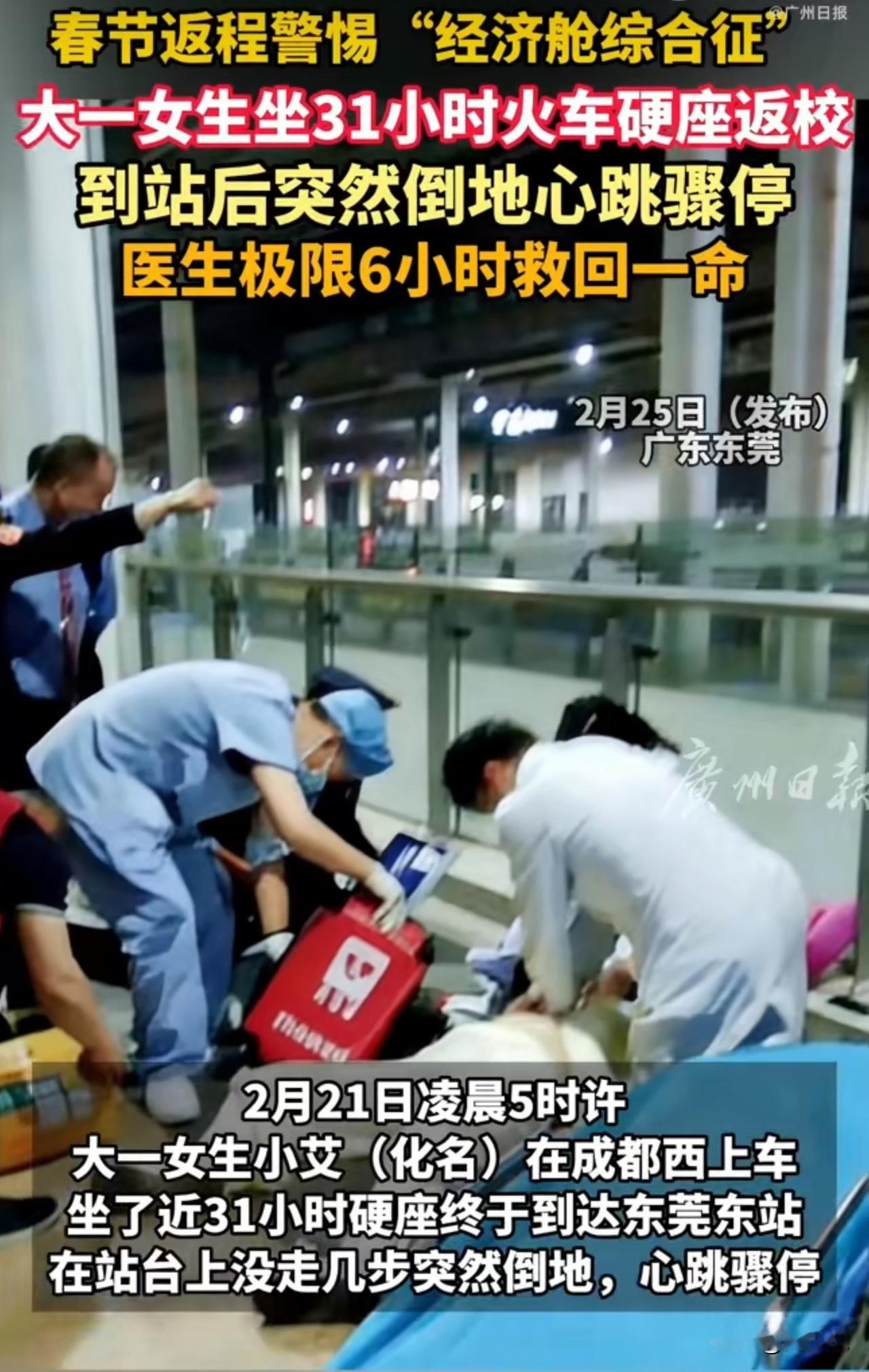 “吓出冷汗!”广东东莞东站,凌晨5点多,一幕让人心惊。一位19岁大一女生,坐了近31小时硬座刚到站,没走几步突然倒地,心脏骤停。万幸,医护人员全力抢救6小时,把她从鬼门关拉了回来。 谁能想到,放倒这位19岁大学女生的,竟是经济舱综合症。出发前她已胸闷两天,却怕耽误报到硬扛着上路。长时间久坐、缺水、劳累叠加,让年轻的身体瞬间“报警”。 此事曝光后,网友看法不一。有网友心疼:“太懂事了,舍不得花钱、不敢耽误课,却把自己逼到危险边缘。” 也有人后怕:“原来长途久坐真的会致命,年轻人别拿身体赌。” 客观的说,周少觉得这事儿给所有人提了个醒。很多学生总觉得自己年轻扛得住,为了省钱、赶时间,不舒服也硬撑,可健康从来没有“将就”可言。 经济舱综合征看似专业,其实就藏在久坐不动里,血液流速变慢、血栓悄悄形成,一旦发作,往往很凶险。 比起“不耽误事”的懂事,学会照顾自己、懂得及时止损,才是更重要的成长。长途出行别硬扛,定时起身活动、多喝温水、身体不适及时求助,这些小事,真的能救命。 总而言之,这事周少认为给所有人都提醒,年轻不是护身符,平安返校、健康上学,才是对自己和家人最好的交代。#寻美三湘# #周少说教育#