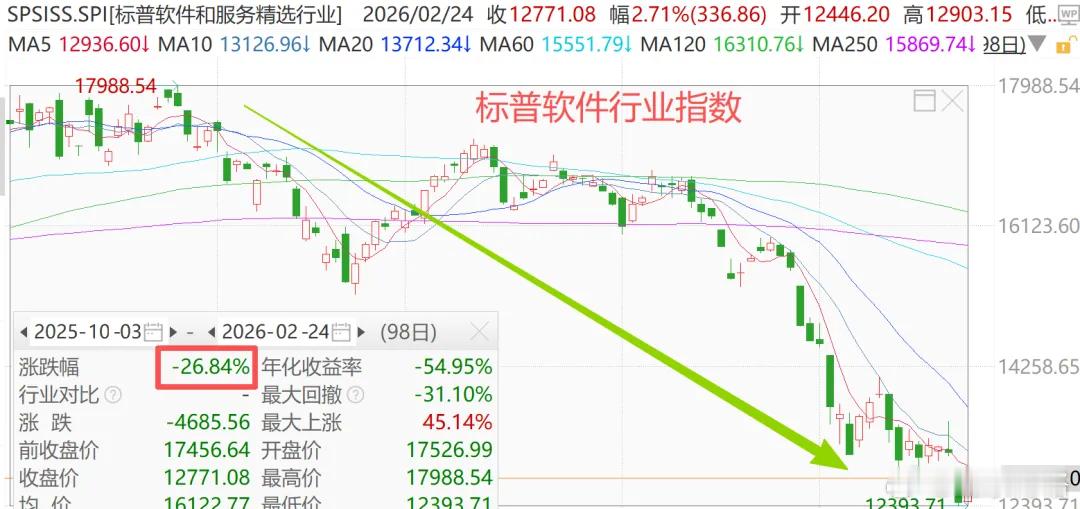 这些逻辑反映到市场上,结果很直观:软件和服务类公司股价一路下跌。我们看美国标普软件与服务精选指数,最近半年跌幅已经接近 27%。最近甚至连 “AI 能写 COBOL 程序” 这一件事,都直接把 IBM 的股价带崩了。往后看,逻辑也很清晰:商旅平台、软件公司订单减少,就得裁员;传统行业用上 AI,效率上去了,但业务增长赶不上效率提升,照样要裁员。而且,做 AI 的公司自己日子也不好过。各大模型内卷越来越激烈,短期赚的那点收入,根本覆盖不了芯片、电力、研发的巨额投入。你看谷歌母公司 Alphabet,都开始发行100 年期英镑债,利率 6.125%,借钱也要硬扛这场 AI 军备竞赛。总结下来就一句话:未来 AI 大发展,赚钱的未必是 AI 公司,但 AI 上游一定能赚钱。比如芯片、光模块、电池、存储、服务器,再往上延伸就是铜铝等资源、电力能源。唯一的风险,就是 AI 这个产业突然不再需要这么大的资源消耗。以上是博格给大家总结的,目前网上主流悲观的逻辑叙事之一。但说实话,博格自己并不认同这个思路。
