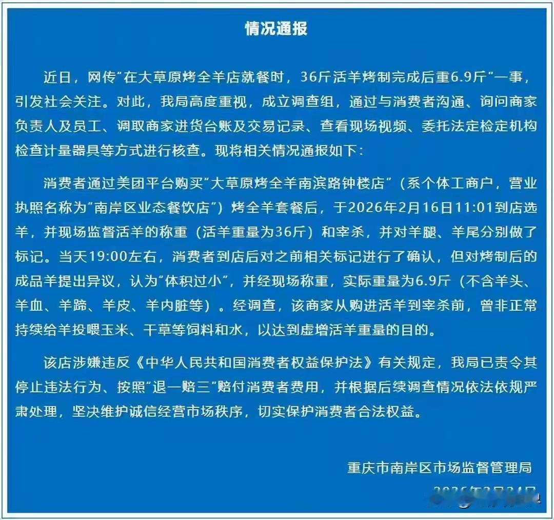 36斤活羊烤完只剩6.9斤,这桩奇葩的消费体验终于迎来了官方定论。 重庆这家烤全羊店被正式调查处理,退一赔三!做生意不讲诚信,人无信不立!这下好了,一旦名声坏了直接玩完!重庆烤全羊 重庆烤羊价格 烤全羊去皮 剥皮烤全羊 重庆羊肉价格 烤活羊