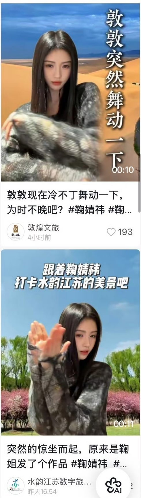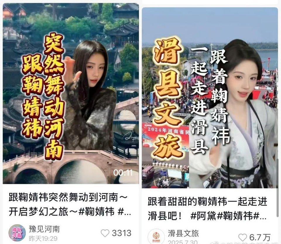 鞠婧祎抖🎶最新手势舞好多文旅官方发,鞠姐在哪都受欢迎