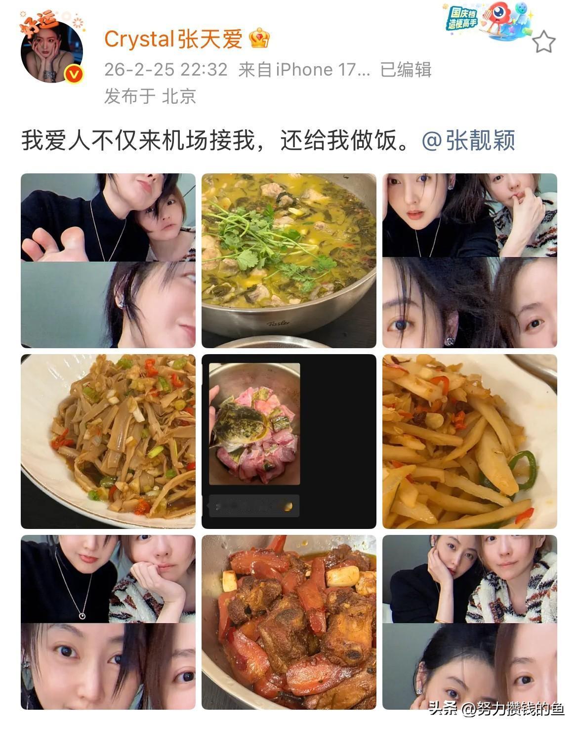 张靓颖张天爱,原来关系这么好; 2月25日22:32分,张天爱在社交平台更新动态:我爱人不仅来机场接我,还给我做饭。 这个爱人不是别人,正是大家熟知的张靓颖; 照片中,张靓颖亲自下厨做饭,色香味俱全,看得出来手艺不错,也看得出来,两人关系很好; 看到张天爱的发文,张靓颖及时回复: 还给你包场~像我这么全线优秀的人上哪去找[害羞] 有网友表示: 果然会做美食的厨师一定是个好歌手 你们幸福就好,不用管我们 一时竟然不知道先羡慕谁 能有这样的好朋友真让人羡慕!