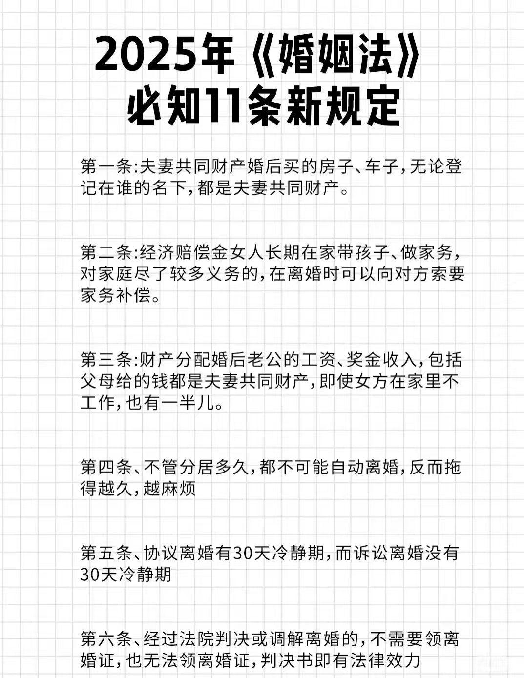 《新婚姻法》让你负责“赚钱养家”和我负责“貌美如花”,从此沦为笑谈——独立是女性婚姻最大的底气 通常所说“新婚姻法”,实为《民法典》婚姻家庭编及相关司法解释。其核心不是“针对谁”,而是以清晰规则打破依附式婚姻幻想,倒逼女性走向经济、人格、精神的全面独立——独立,才是婚姻里最硬的底气。 婚前房产归登记方,婚后共同还贷及对应增值部分仅作补偿,不会因结婚自动转为共同财产。这意味着,房产证加名不是万能保障,自己挣来的资产才真正可控。一方私下大额举债,未用于家庭生活且未共同签字的,不属于夫妻共同债务。这为女性穿上“防护甲”,避免为配偶个人过错背负半生债务。负担较多抚育子女、照料老人、协助工作等义务的一方,离婚时有权请求经济补偿。这既肯定了家庭付出,也提醒牺牲不能成为失去自我的理由,独立能力才是底线。 经济独立是底线——做好个人理财,逐步积累可控资产,让银行卡余额比口头承诺更可靠。 法律意识是护盾——婚前明确财产状况,必要时签订婚前协议,婚后关注共同财产变动,大额事项坚持“共签”,留存家务劳动、育儿、赡养的证据为可能的补偿主张提供支撑。人格独立是根基——保持社交圈与个人爱好,不依附于婚姻身份,拥有自主决策能力,无论是职业选择还是家庭规划,都有“说不”底气。婚姻回归本质——婚姻不是“脱贫工具”,而是两个人并肩同行的伙伴关系。好的婚姻,是彼此成就,而非一方依附另一方生存。 《民法典》的规则看似冰冷,实则是在为女性的自由与尊严筑牢底线。它不否定婚姻的美好,而是提醒我们——安全感从来不在别人的房产证里,而在自己的能力与选择中。 独立,不是女性在婚姻里的“加分项”,而是立足的“必修课”。唯有先成为更好的自己,才能从容面对婚姻的各种可能,在爱里有底气,在离开时有余地。