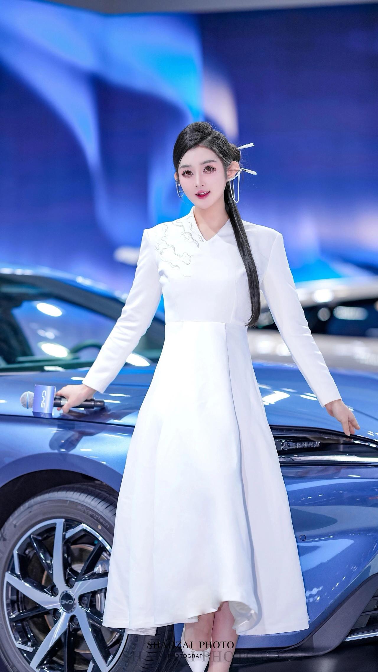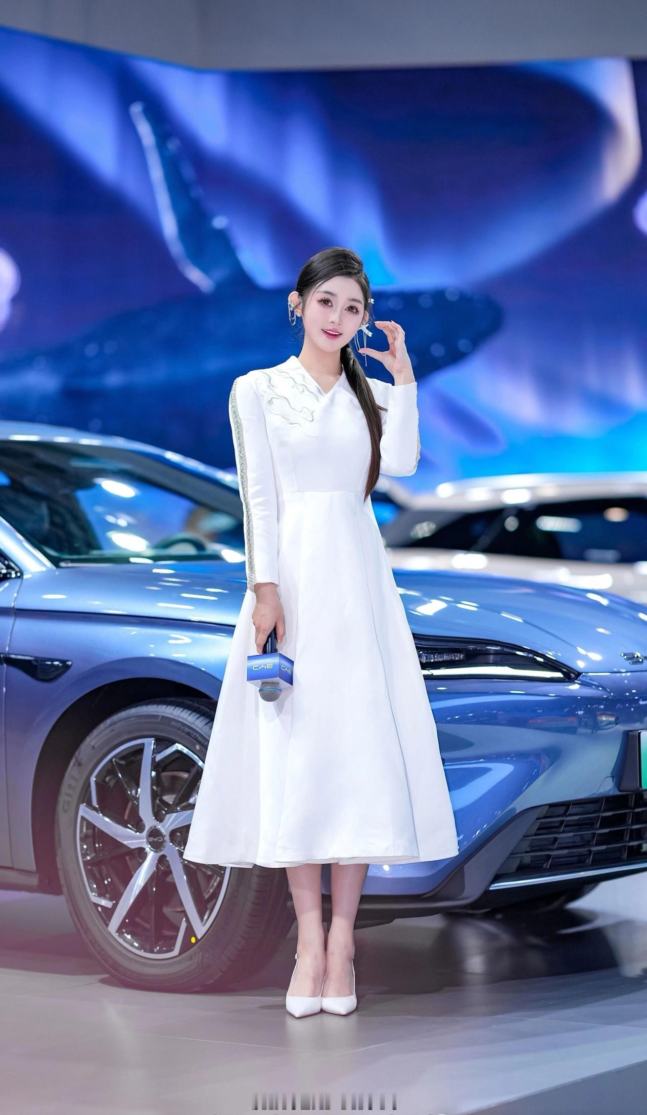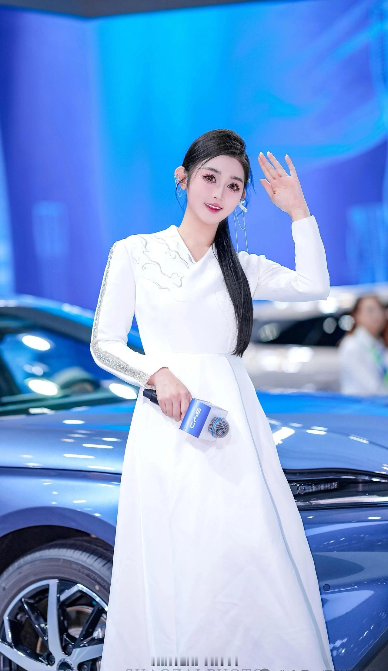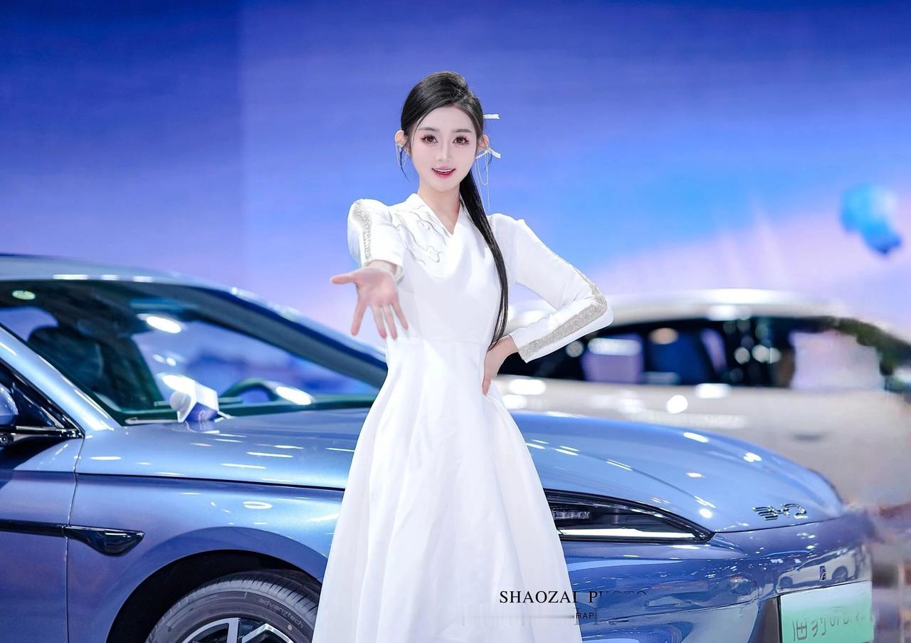 这位小姐姐在车展的舞台上,宛如从东方美学画卷中走出的仙子,又带着现代科技的灵动光芒✨ 她将乌黑的长发精心盘起,用简约的白色发饰点缀,几缕发丝垂落肩头,衬得脸庞愈发精致。一双杏眼清澈明亮,眼妆带着恰到好处的灵动,唇色温柔,笑起来时眼波流转,既有着东方美人的温婉,又不失专业主持人的自信。 她身着一袭白色新中式长裙,V领设计勾勒出柔美的肩颈线条,肩部与袖身的银色云纹刺绣与亮片装饰,在灯光下熠熠生辉,既传承了东方美学的雅致,又融入了现代设计的利落。收腰的版型凸显出纤细的腰身,裙摆垂坠飘逸,行走间自带仙气。 在蓝色的比亚迪汽车与科技感十足的背景前,她时而手持带有“BYD”标识的麦克风,专业从容;时而倚靠车身,姿态优雅;时而挥手比心,灵动俏皮。白色的裙装与蓝色的展车形成鲜明对比,让她在现代车展的喧嚣中,成为一道兼具东方韵味与未来感的独特风景,美得让人过目难忘。