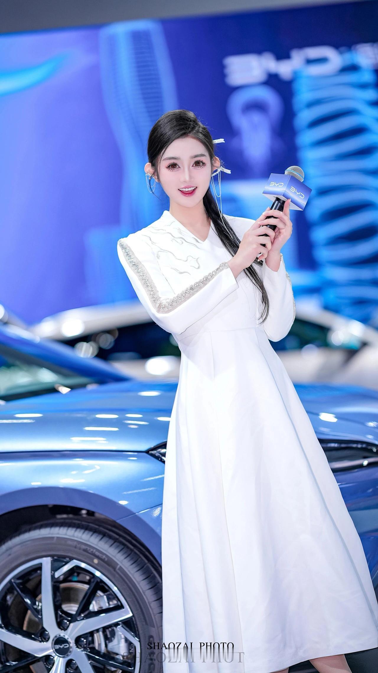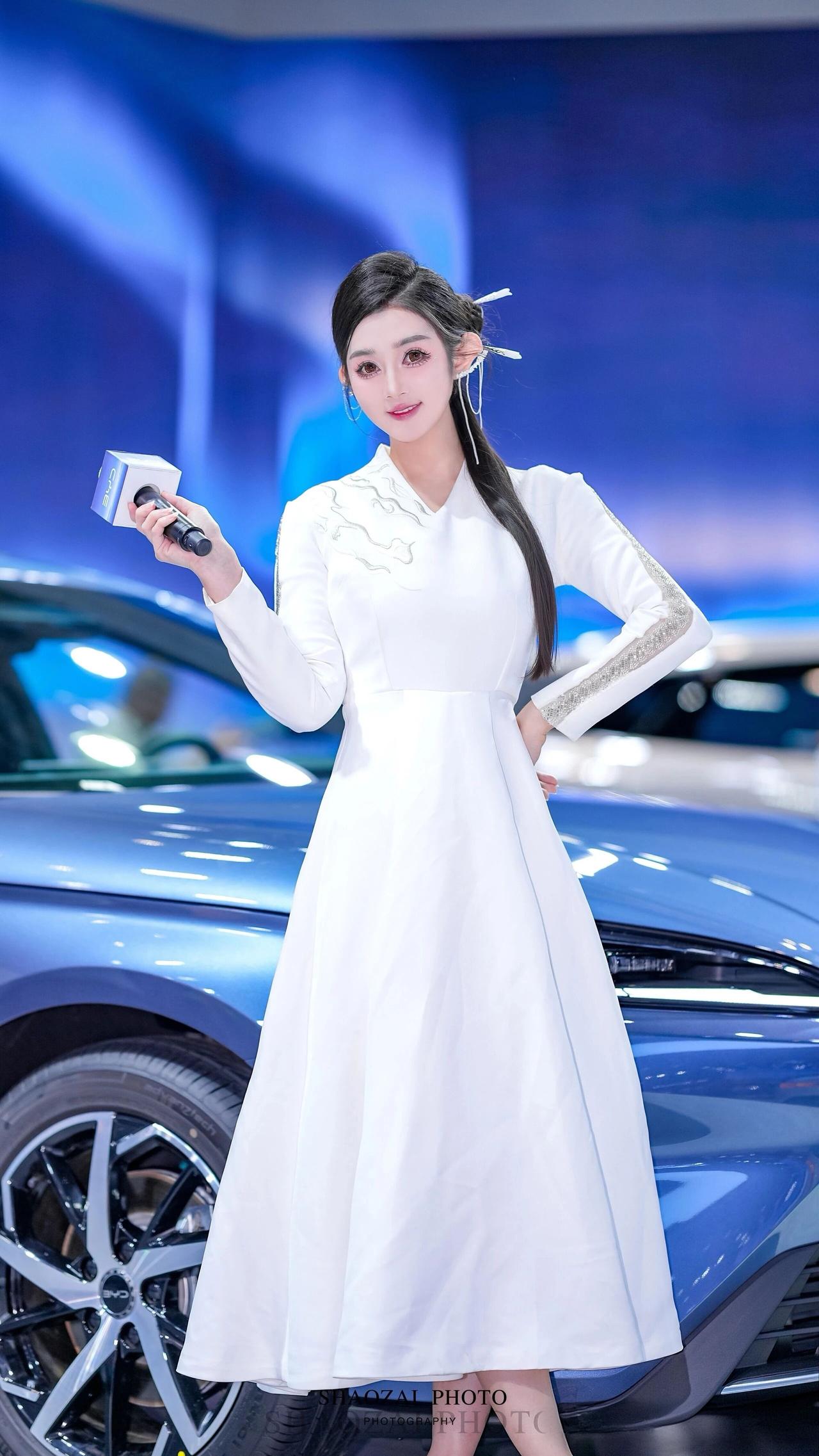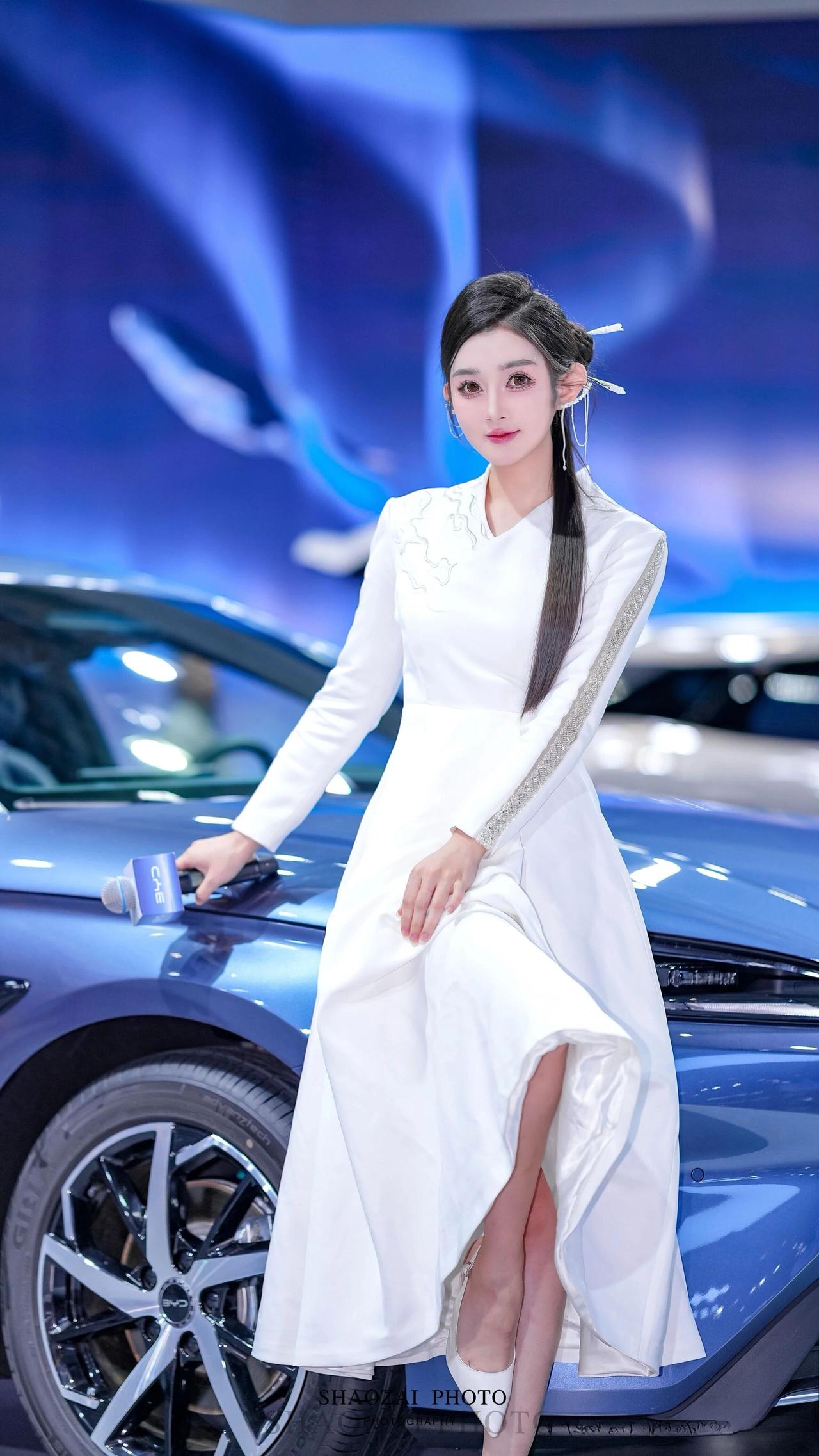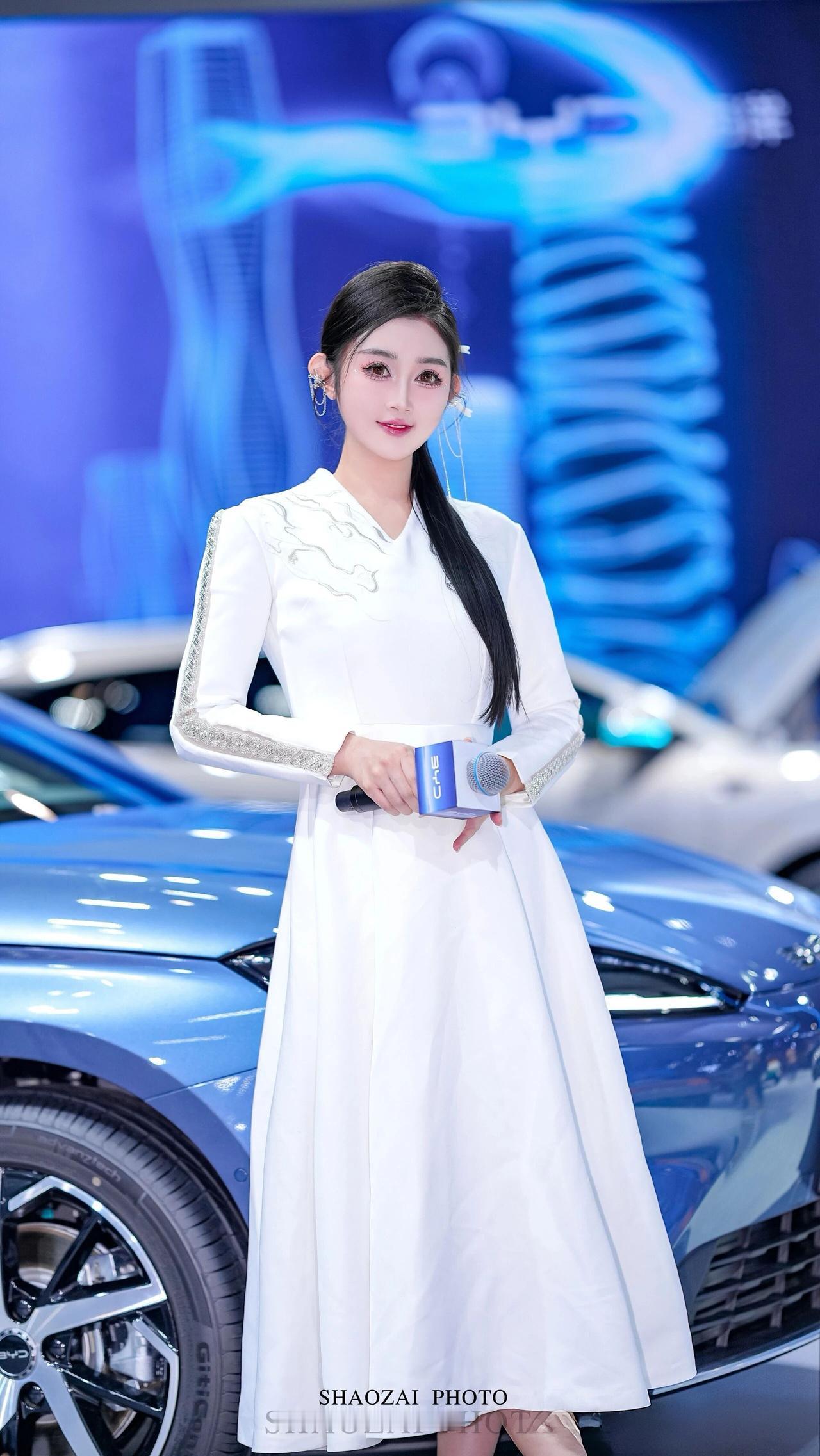 这位小姐姐在车展的舞台上,宛如从东方美学画卷中走出的仙子,又带着现代科技的灵动光芒✨ 她将乌黑的长发精心盘起,用简约的白色发饰点缀,几缕发丝垂落肩头,衬得脸庞愈发精致。一双杏眼清澈明亮,眼妆带着恰到好处的灵动,唇色温柔,笑起来时眼波流转,既有着东方美人的温婉,又不失专业主持人的自信。 她身着一袭白色新中式长裙,V领设计勾勒出柔美的肩颈线条,肩部与袖身的银色云纹刺绣与亮片装饰,在灯光下熠熠生辉,既传承了东方美学的雅致,又融入了现代设计的利落。收腰的版型凸显出纤细的腰身,裙摆垂坠飘逸,行走间自带仙气。 在蓝色的比亚迪汽车与科技感十足的背景前,她时而手持带有“BYD”标识的麦克风,专业从容;时而倚靠车身,姿态优雅;时而挥手比心,灵动俏皮。白色的裙装与蓝色的展车形成鲜明对比,让她在现代车展的喧嚣中,成为一道兼具东方韵味与未来感的独特风景,美得让人过目难忘。