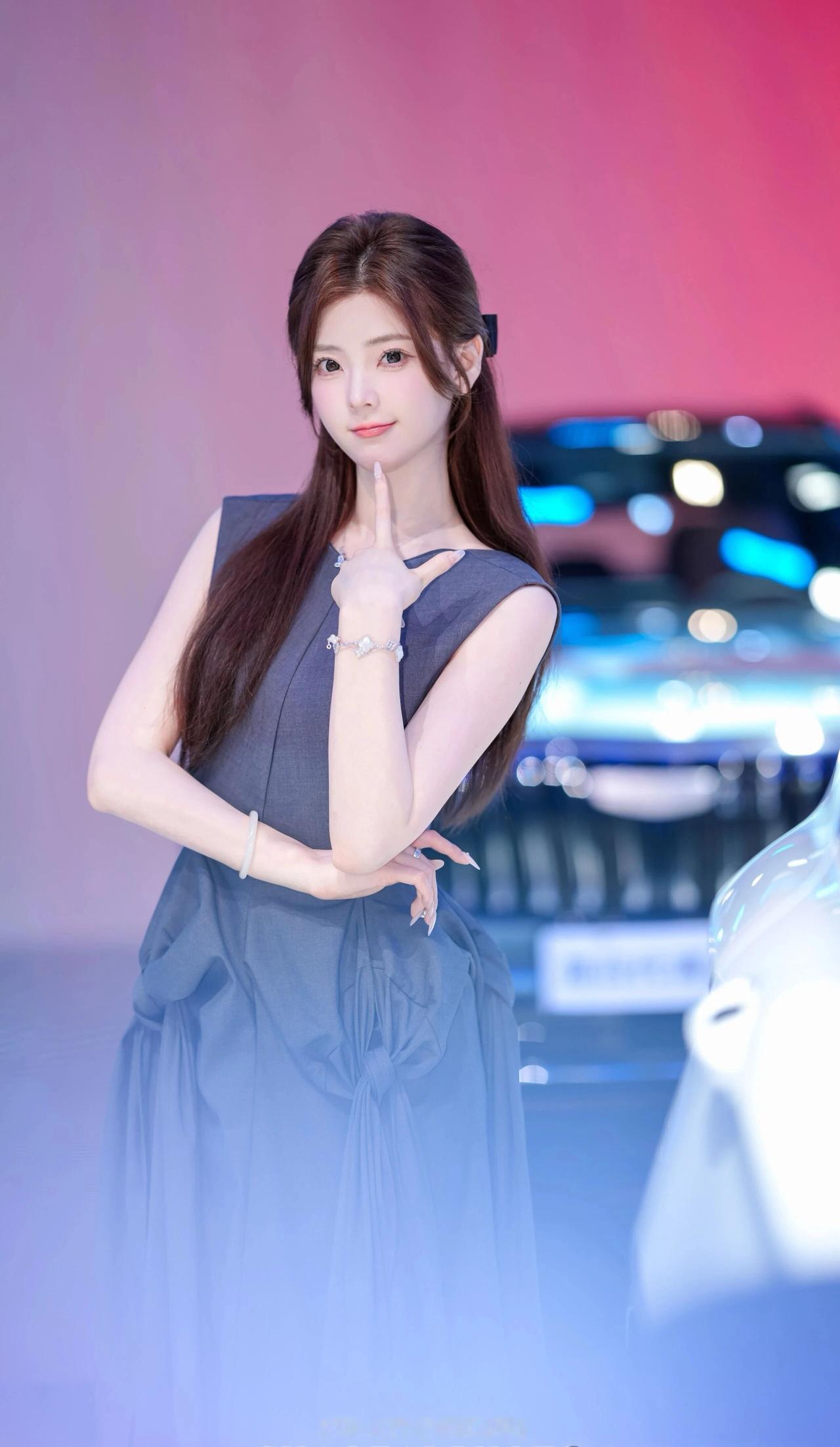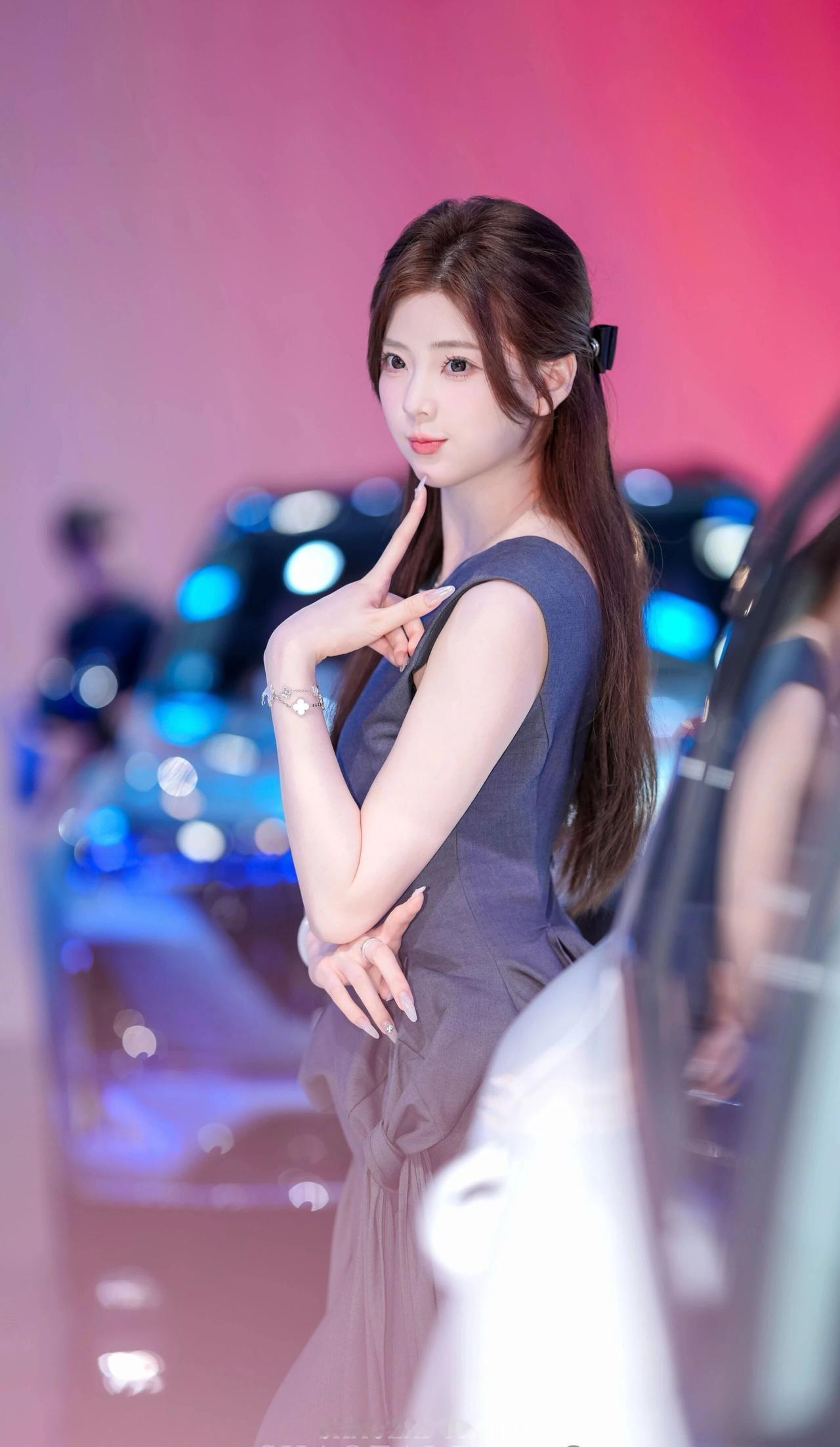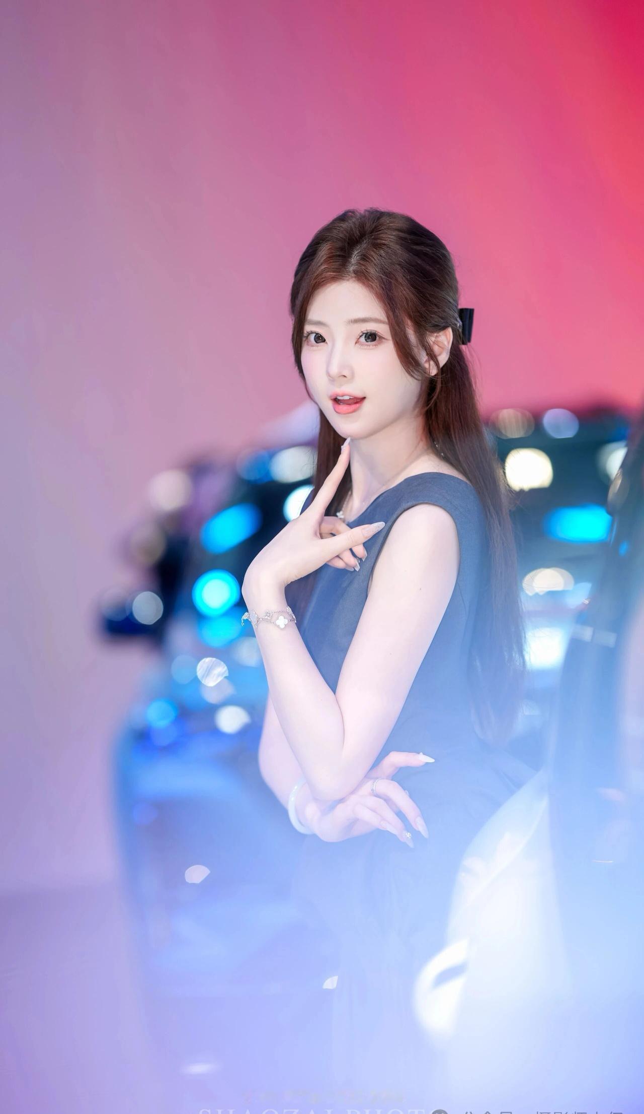 她留着一头柔顺的深棕色长发,用黑色蝴蝶结发夹半扎在脑后,几缕碎发垂在脸颊旁,衬得脸庞愈发小巧精致。一双杏眼清澈明亮,眼尾微微上挑,眼妆精致又不失灵动,笑起来时眼波流转,像藏着星光;皮肤白皙细腻,透着淡淡的粉晕,唇色温柔,一颦一笑都带着恰到好处的甜美与元气。 她身着深灰色无袖连衣裙,上半身是挺括的西装面料,腰部的扭结褶皱设计极具艺术感,下摆则是轻盈飘逸的纱质面料,在灯光下泛着柔和的光泽,既勾勒出柔美的肩颈线条,又增添了几分灵动仙气。手腕上的银色手链、玉镯与颈间的小项链,为整体造型点缀出精致细节。 在红蓝渐变的车展背景与汽车光斑的映衬下,她时而俏皮比心,时而托腮浅笑,时而侧身倚靠车身,每一个姿态都灵动又治愈,像从画报里走出来的甜系少女,自带一种松弛又高级的氛围感,让人忍不住心动。