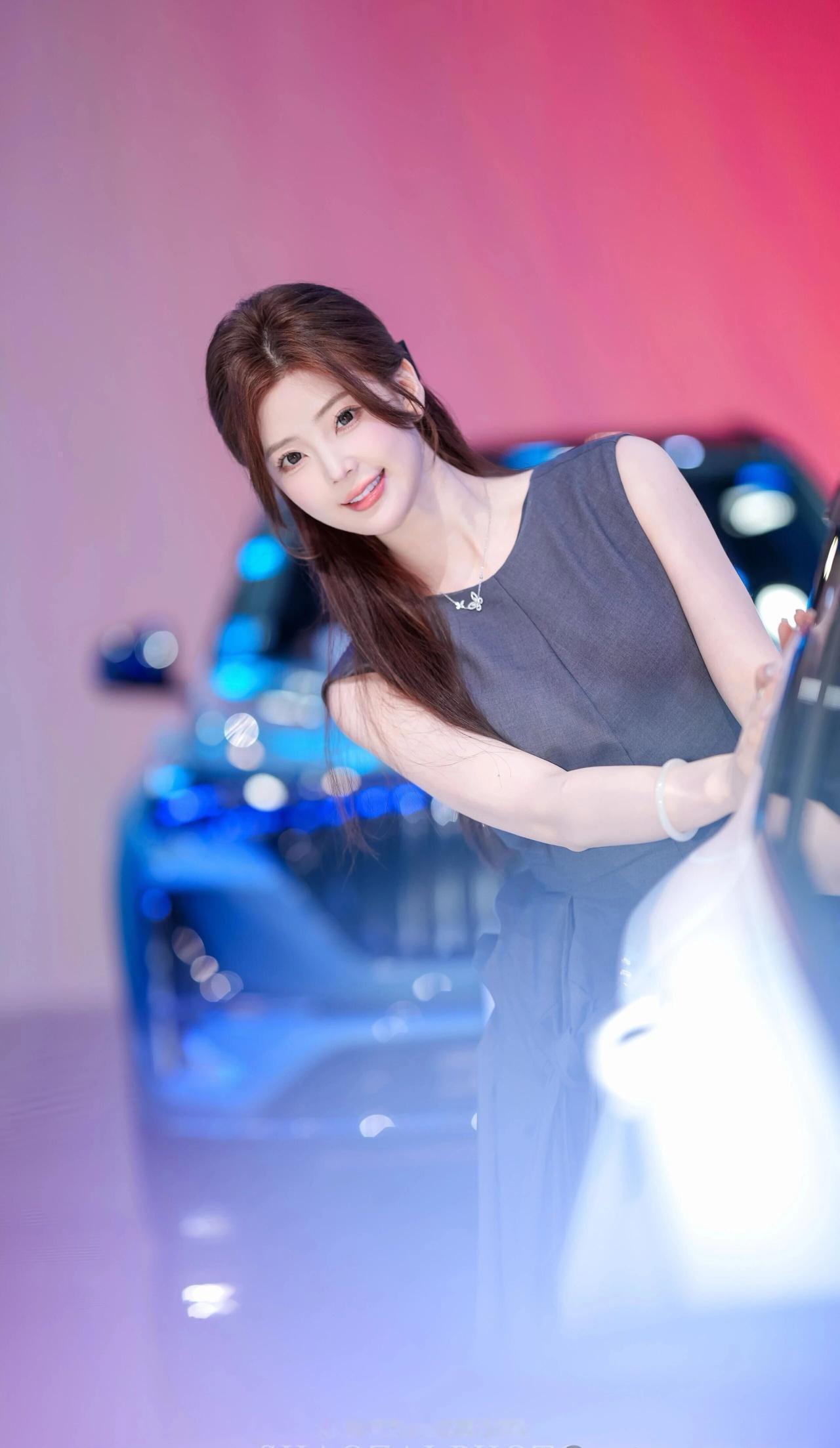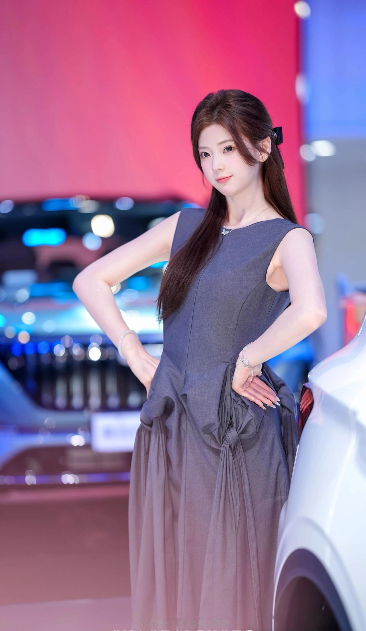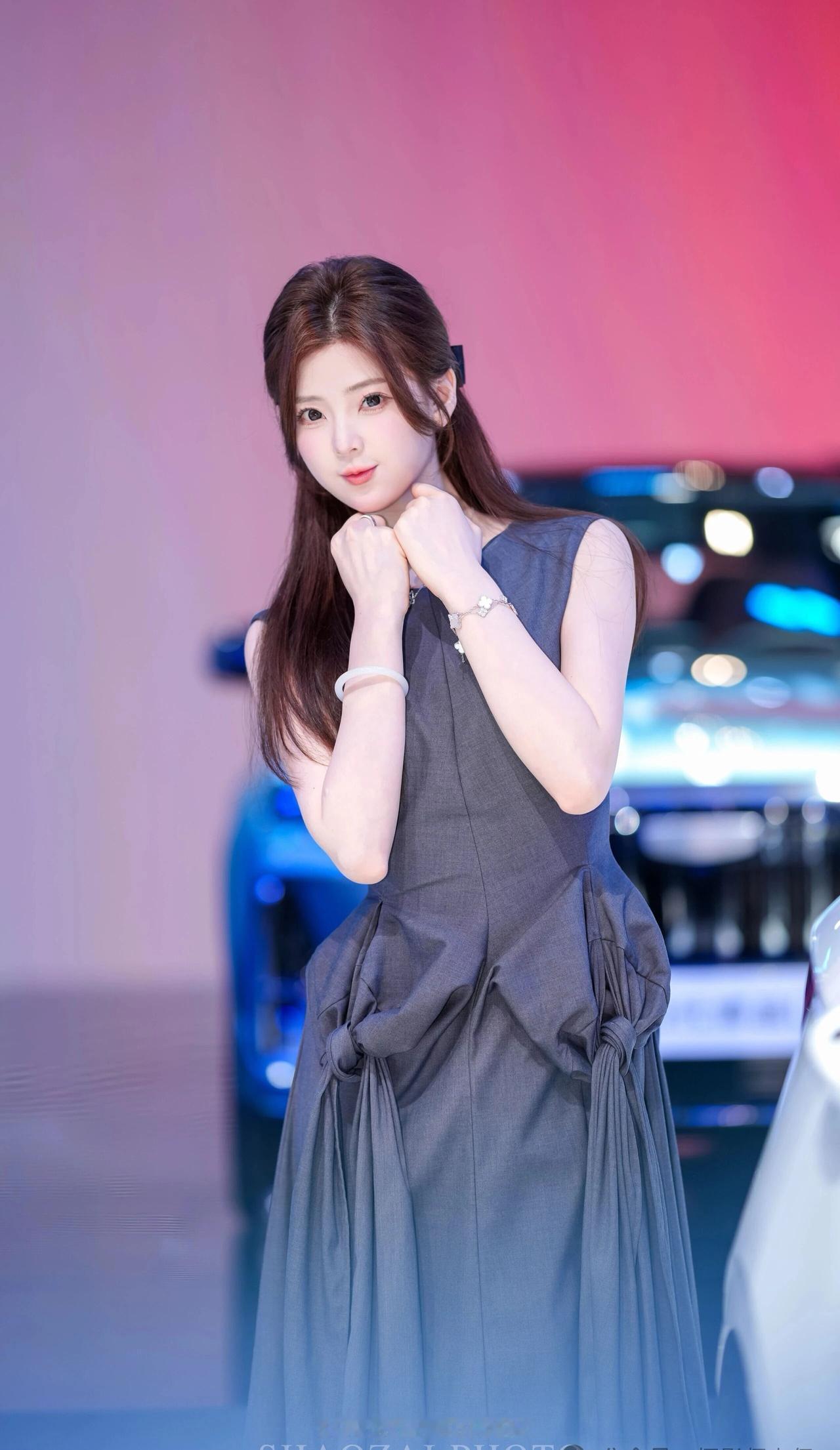 她留着一头柔顺的深棕色长发,用黑色蝴蝶结发夹半扎在脑后,几缕碎发垂在脸颊旁,衬得脸庞愈发小巧精致。一双杏眼清澈明亮,眼尾微微上挑,眼妆精致又不失灵动,笑起来时眼波流转,像藏着星光;皮肤白皙细腻,透着淡淡的粉晕,唇色温柔,一颦一笑都带着恰到好处的甜美与元气。 她身着深灰色无袖连衣裙,上半身是挺括的西装面料,腰部的扭结褶皱设计极具艺术感,下摆则是轻盈飘逸的纱质面料,在灯光下泛着柔和的光泽,既勾勒出柔美的肩颈线条,又增添了几分灵动仙气。手腕上的银色手链、玉镯与颈间的小项链,为整体造型点缀出精致细节。 在红蓝渐变的车展背景与汽车光斑的映衬下,她时而俏皮比心,时而托腮浅笑,时而侧身倚靠车身,每一个姿态都灵动又治愈,像从画报里走出来的甜系少女,自带一种松弛又高级的氛围感,让人忍不住心动。