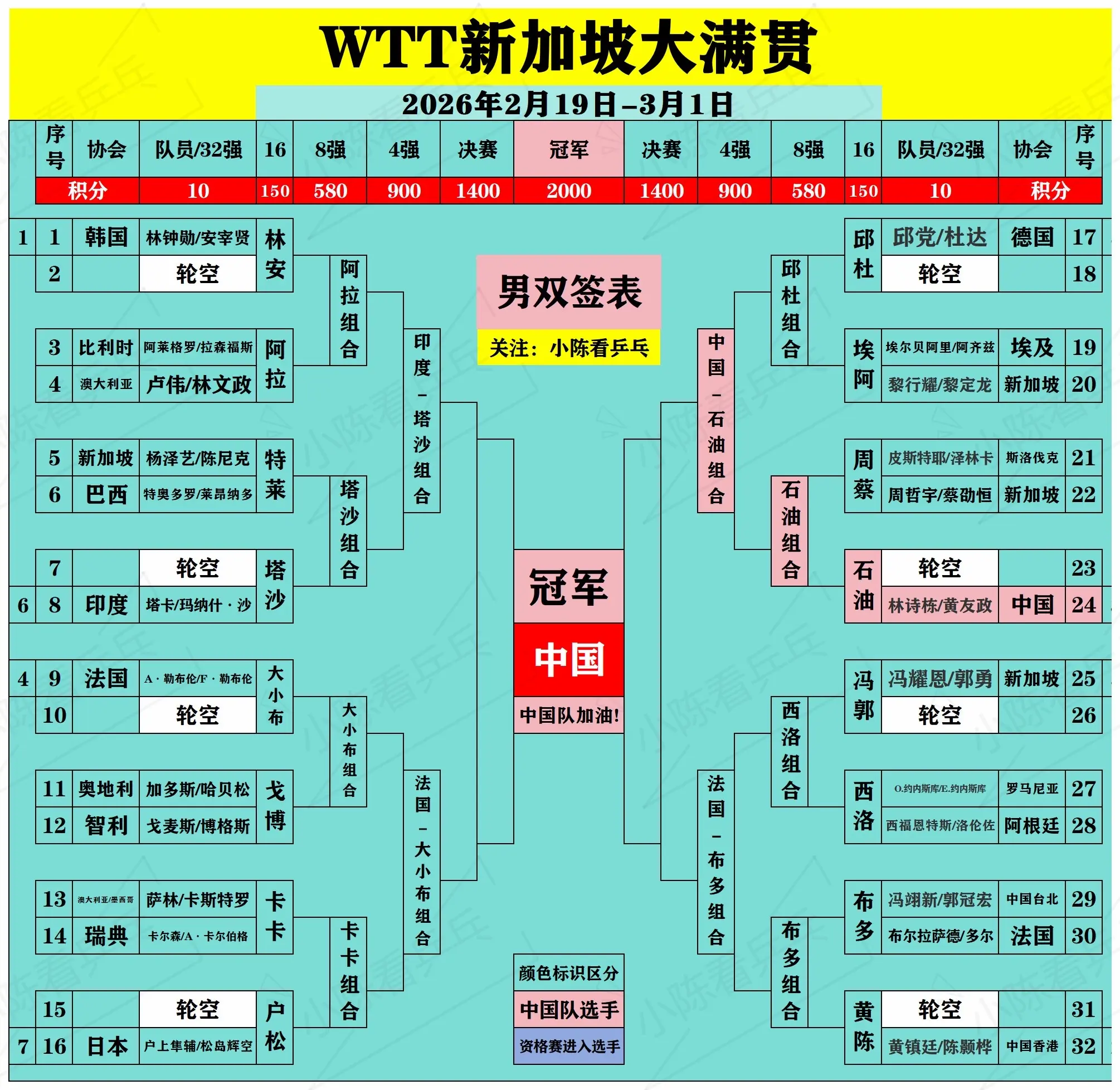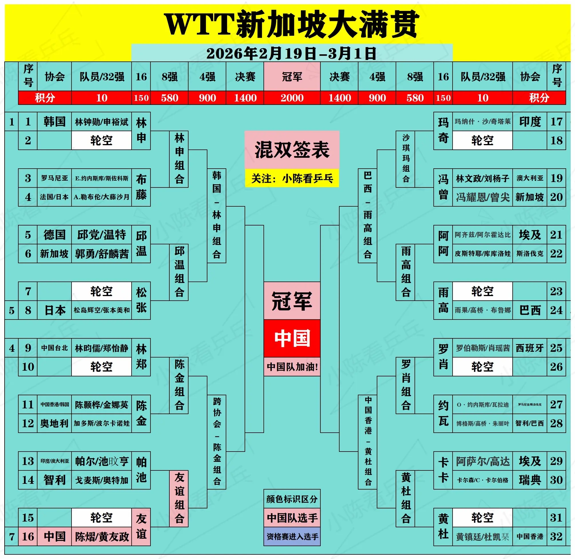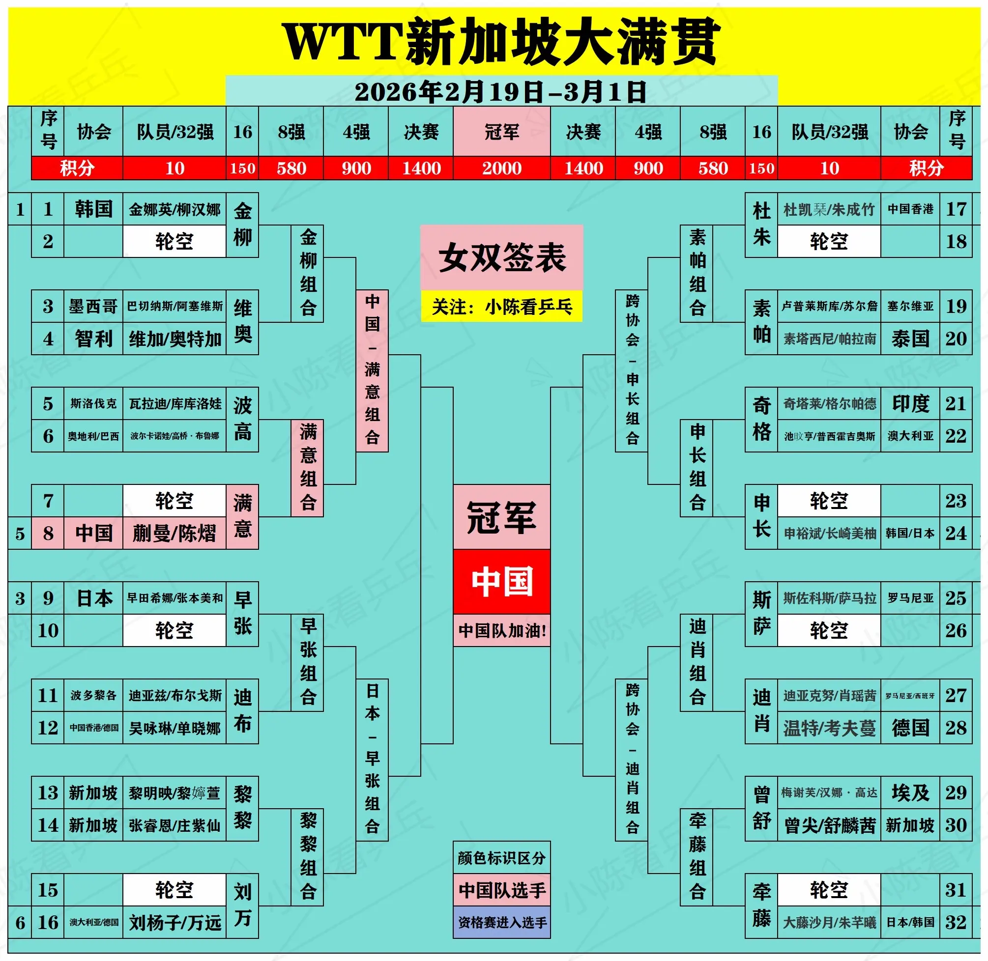 WTT新加坡大满贯签位图更新2月25日。WTT新加坡大满贯签位图更新2...