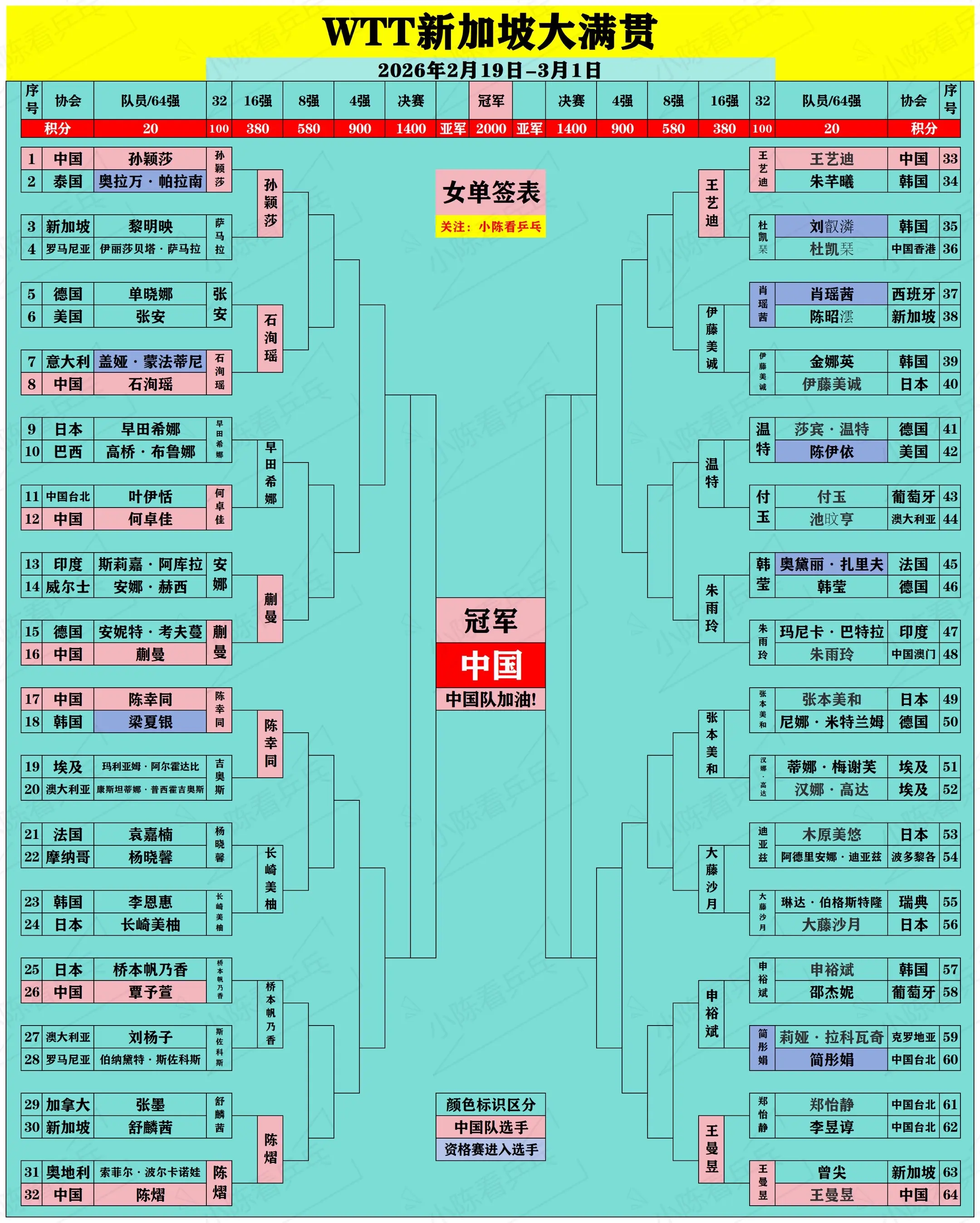 WTT新加坡大满贯签位图更新2月24日。WTT新加坡大满贯签位图更新2...