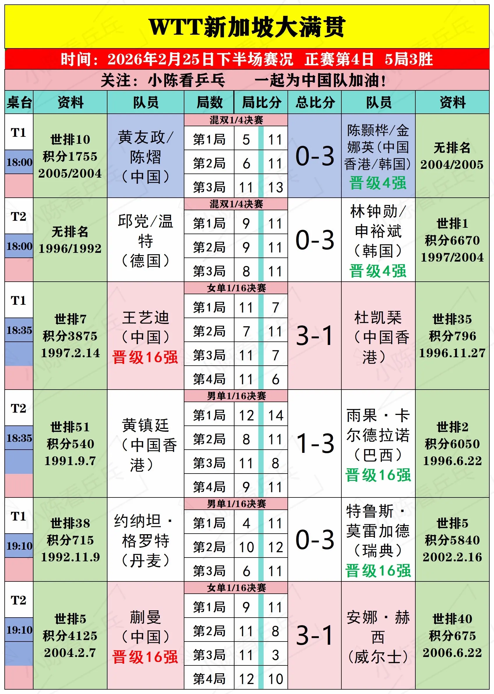 WTT新加坡大满贯2月25日下半场赛况。WTT新加坡大满贯2月25日下半场比赛结果,中国队混双黄友政/陈熠0-3不敌跨协会组合陈颢桦/金娜英(中国香港/韩国)无缘4强,其余中国队场次均取得顺利晋级下一轮,中国队继续加油。