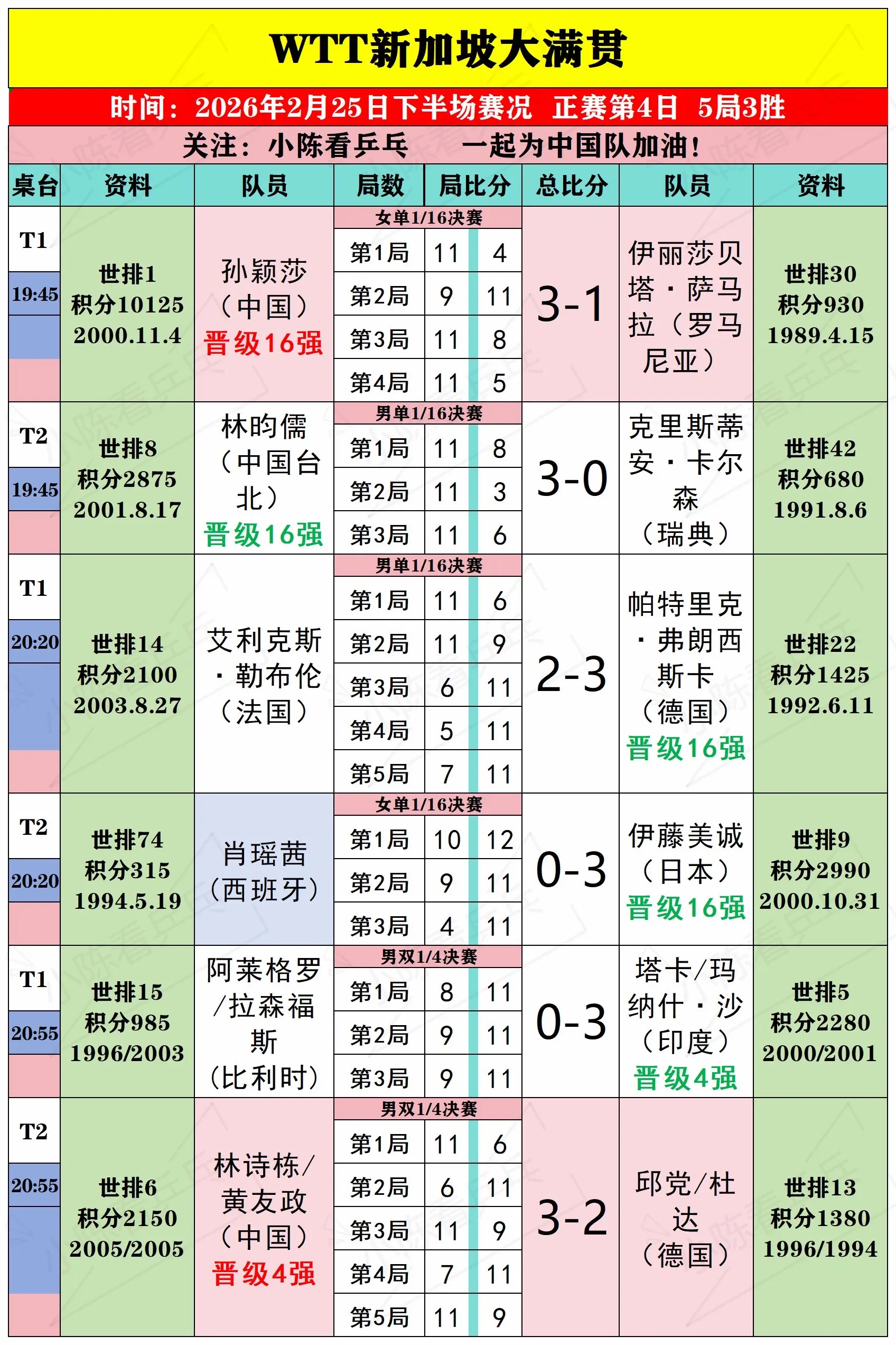 WTT新加坡大满贯2月25日上半场赛况。WTT新加坡大满贯2月25日上...