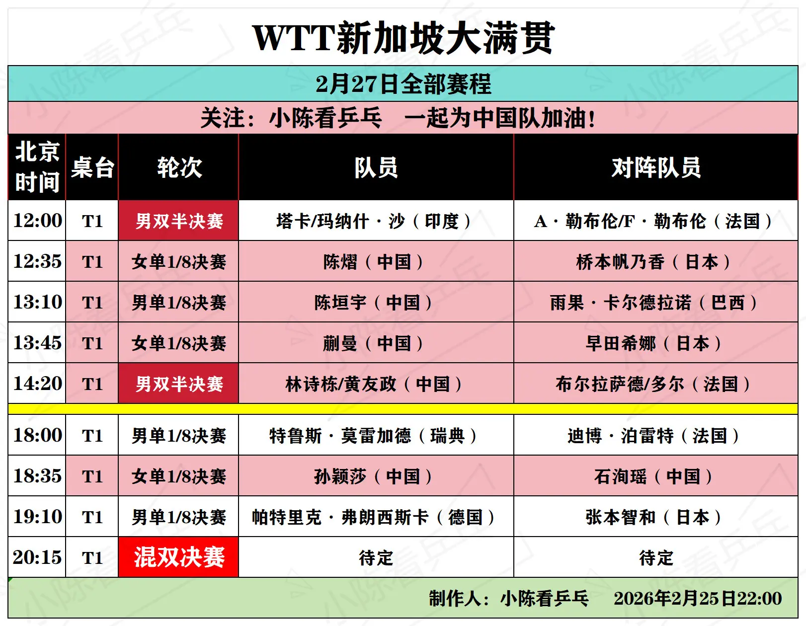 WTT新加坡大满贯2月27日全部赛程。WTT新加坡大满贯2月27日全部赛程,男女单打1/8决赛,男双半决赛,混双决赛,中国队继续加油。