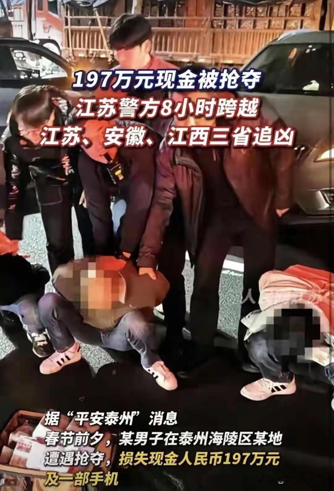 197万现金被抢!警方8小时神速破案,网友:这速度太给力了! 春节假期刚过的第一个工作日,泰州的街头就出大事了!四个抢匪盯上了197万现金,拿到钱后直接上演了现实版的“速度与激情”,开着车一路飙到三个省逃窜。 监控画面拍到,这几个抢匪分工特别清楚,开着改装过的车绕开了电子监控的“防护网”。可谁也没想到,泰州警方反应特别快,刑侦、技侦、巡逻的警察一起行动,只用了四个小时就找到了他们的下落,八个小时就追出了好几个省。最后在江西的收费站,把这四个人全部抓住了,197万现金一分都没少! 律师分析,这么大的金额已经算“特别巨大”了,判刑肯定至少要十年以上。网友们也在讨论:都到2026年了,还有人带这么多现金出门啊?其实现在乡镇上的小商店还是习惯用现金交易,去年这种类似的案子还多了17%呢。 这案子简直就是破案的“教科书”,没放一枪就把人抓住、钱追回了。警察也提醒大家:大额的钱最好用电子转账,要是遇到危险,先保证自己安全再报警。时代一直在变,但安全永远是第一位的!那你平时出门会带很多现金吗?遇到这种突发情况,你觉得该怎么快速应对?