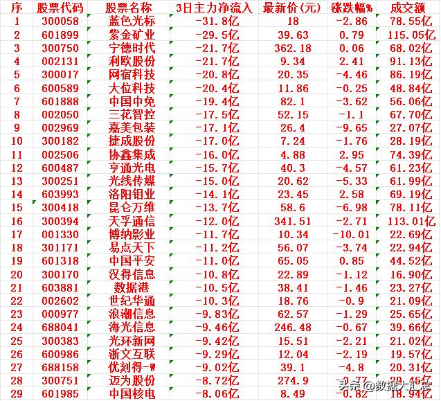 当心!2月26日,前3天主力大幅卖出的30名单 蓝色光标:3日净流出 31.8亿元,跌幅 -2.86% 紫金矿业:3日净流出 29.5亿元,涨幅 +0.79% 宁德时代:3日净流出 21.7亿元,涨幅 +0.06% 利欧股份:3日净流出 21.7亿元,涨幅 +2.41% 网宿科技:3日净流出 20.8亿元,跌幅 -4.46% 大位科技:3日净流出 20.4亿元,跌幅 -0.25% 中国中免:3日净流出 19.4亿元,跌幅 -3.62% 三花智控:3日净流出 17.5亿元,跌幅 -1.10% 嘉美包装:3日净流出 17.1亿元,跌幅 -9.65% 捷成股份:3日净流出 17.0亿元,跌幅 -1.76%
