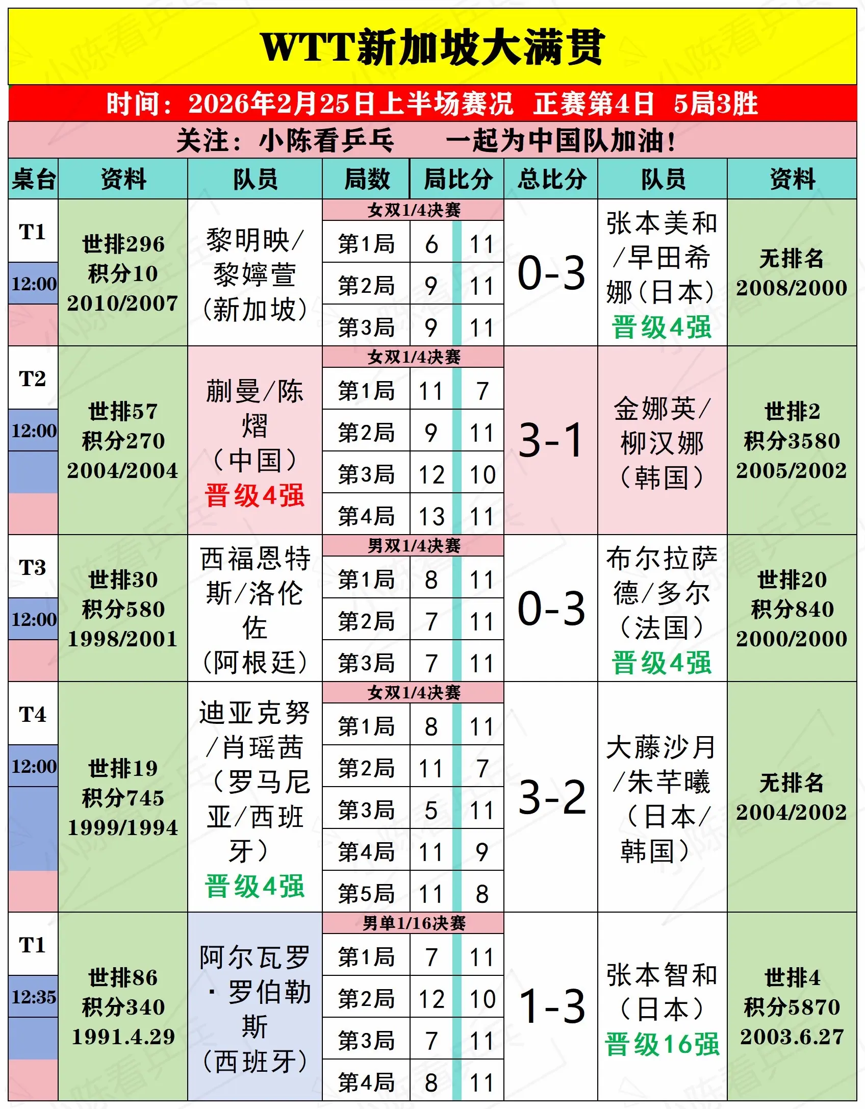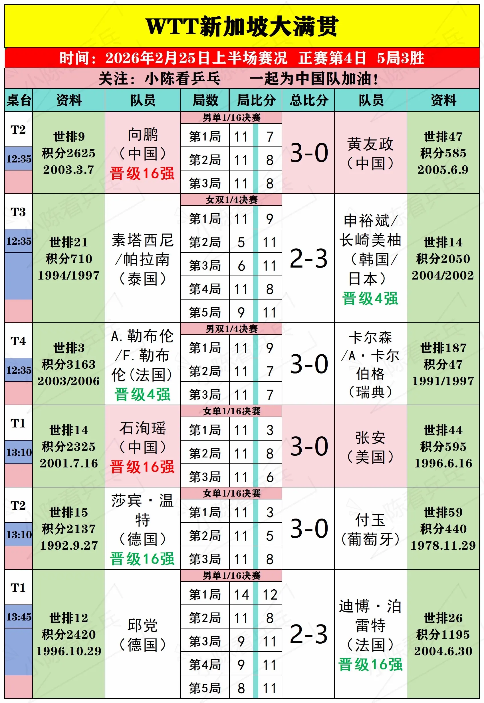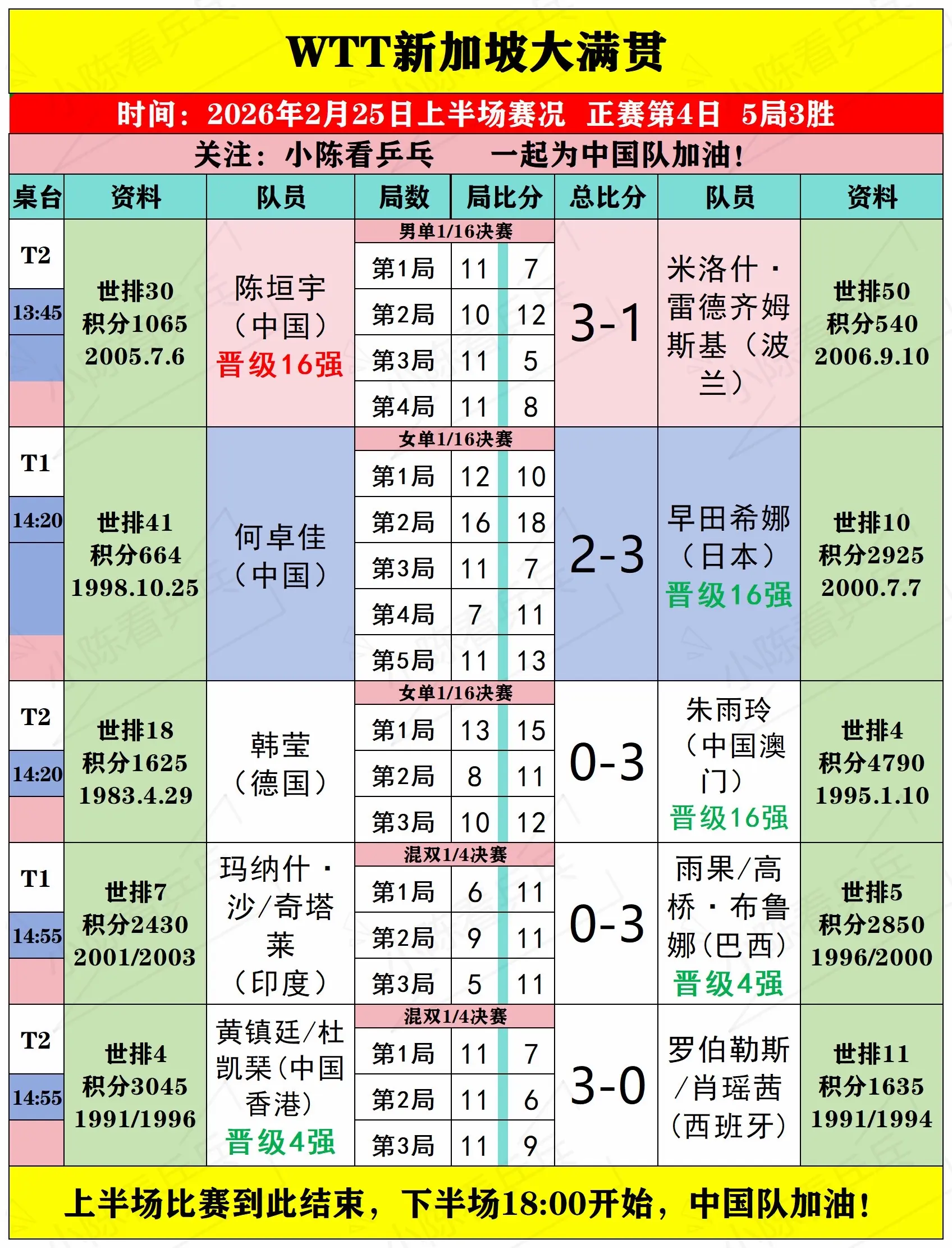WTT新加坡大满贯2月25日上半场赛况。WTT新加坡大满贯2月25日上...