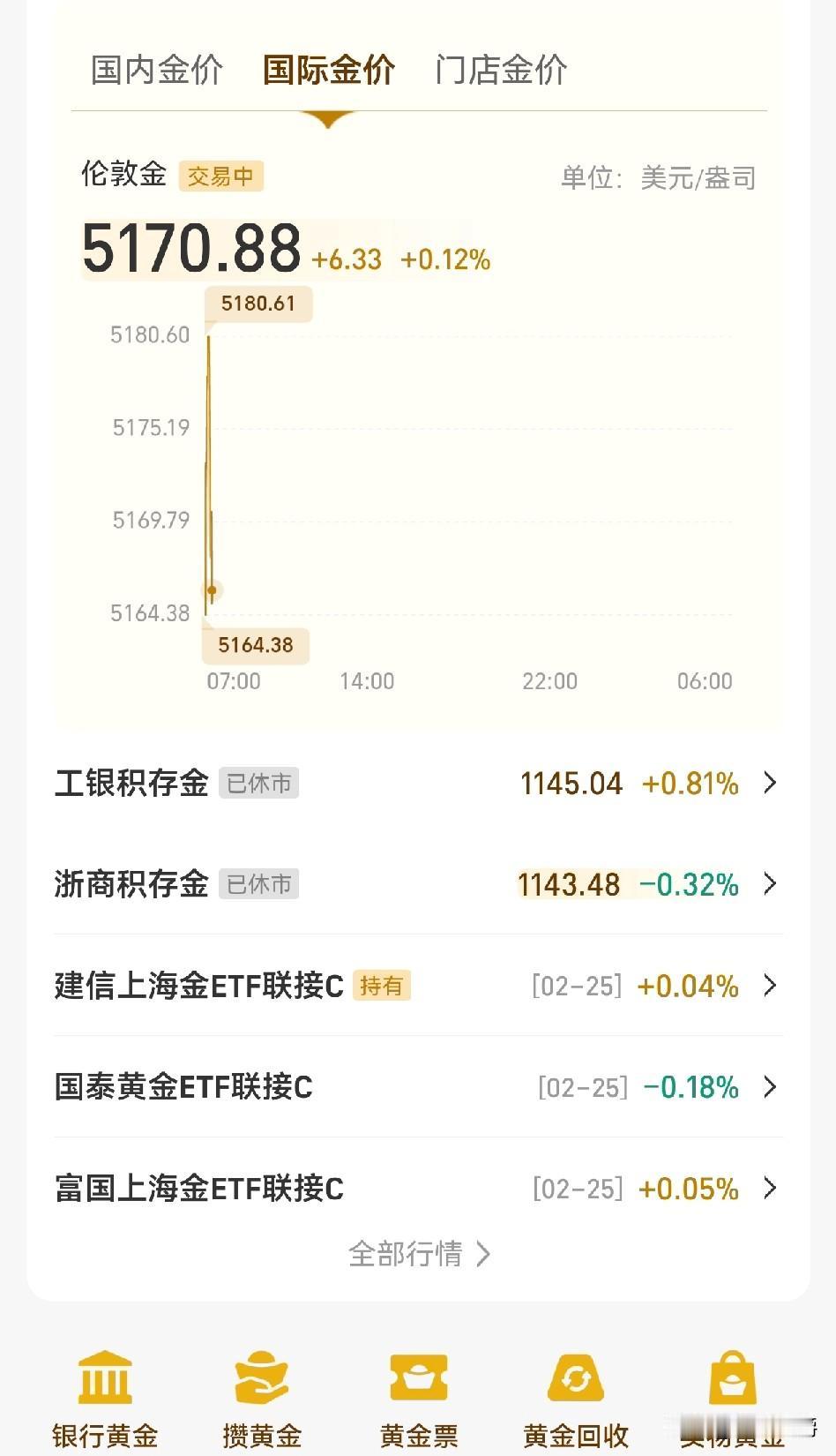今日黄金开盘5170美元, 最近几天的黄金价格还算稳定,都在5160-5200间忽闪忽闪。 现在是5170美元,按照我观察,一般到9点国内开盘后开始拉升。今天预计会小跌。 我现在倒是希望来个大跳水,因为我年前大跳水那天工作特忙,没加仓。如果在年前1030时加一万,现在早下树了。 再来一次跳水,只需到1100以下,我加仓2万。但现在都是微跌微涨,难有机会加仓。 不过根据各机构预测,今年涨到1500没问题,如果能达到1500元,现在1145上车也可以,昨天看到有个朋友就以1145价重仓入场50万,佩服! 征求下大家意见,大家觉得现在1145左右可以上车吗?