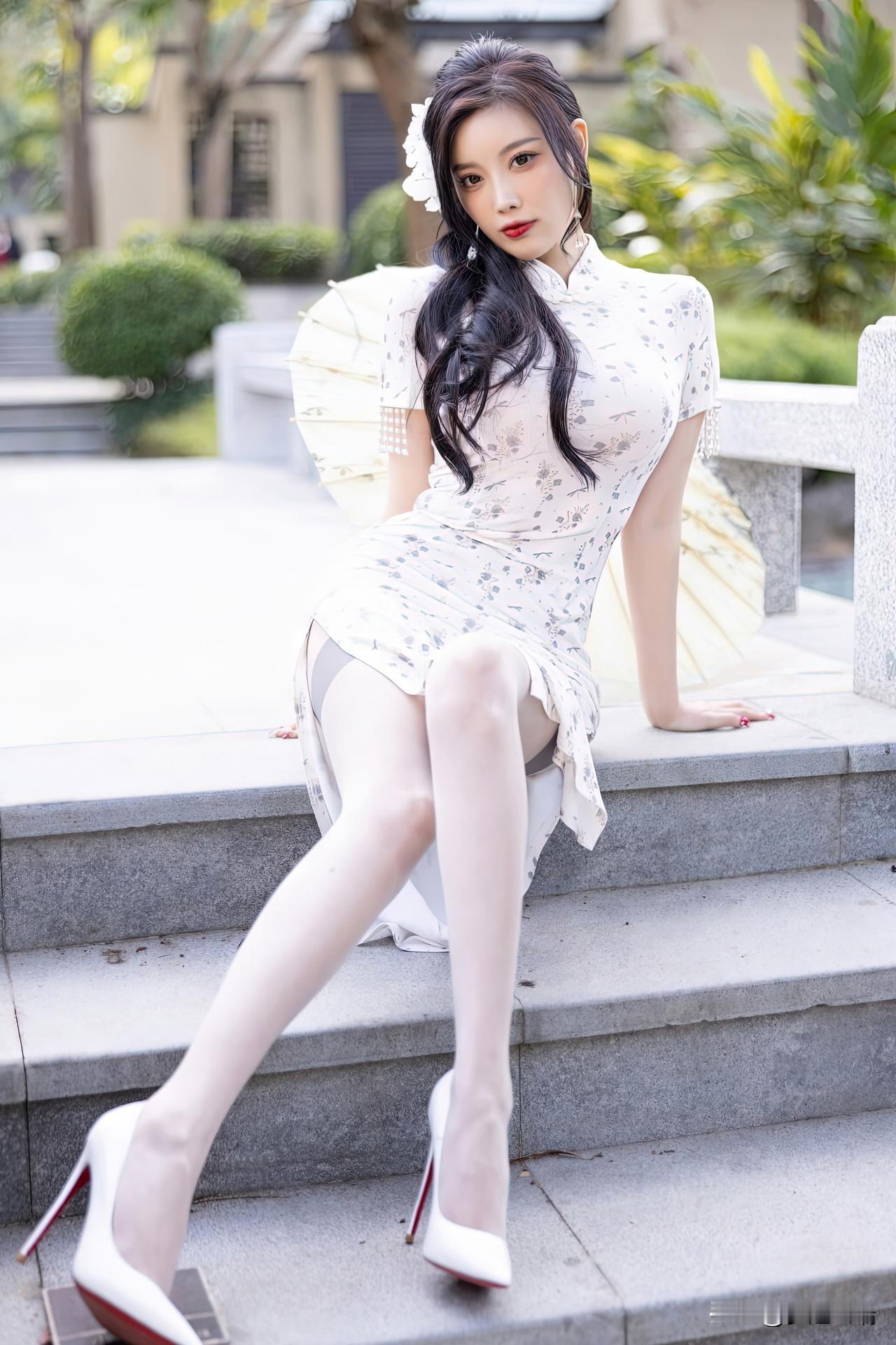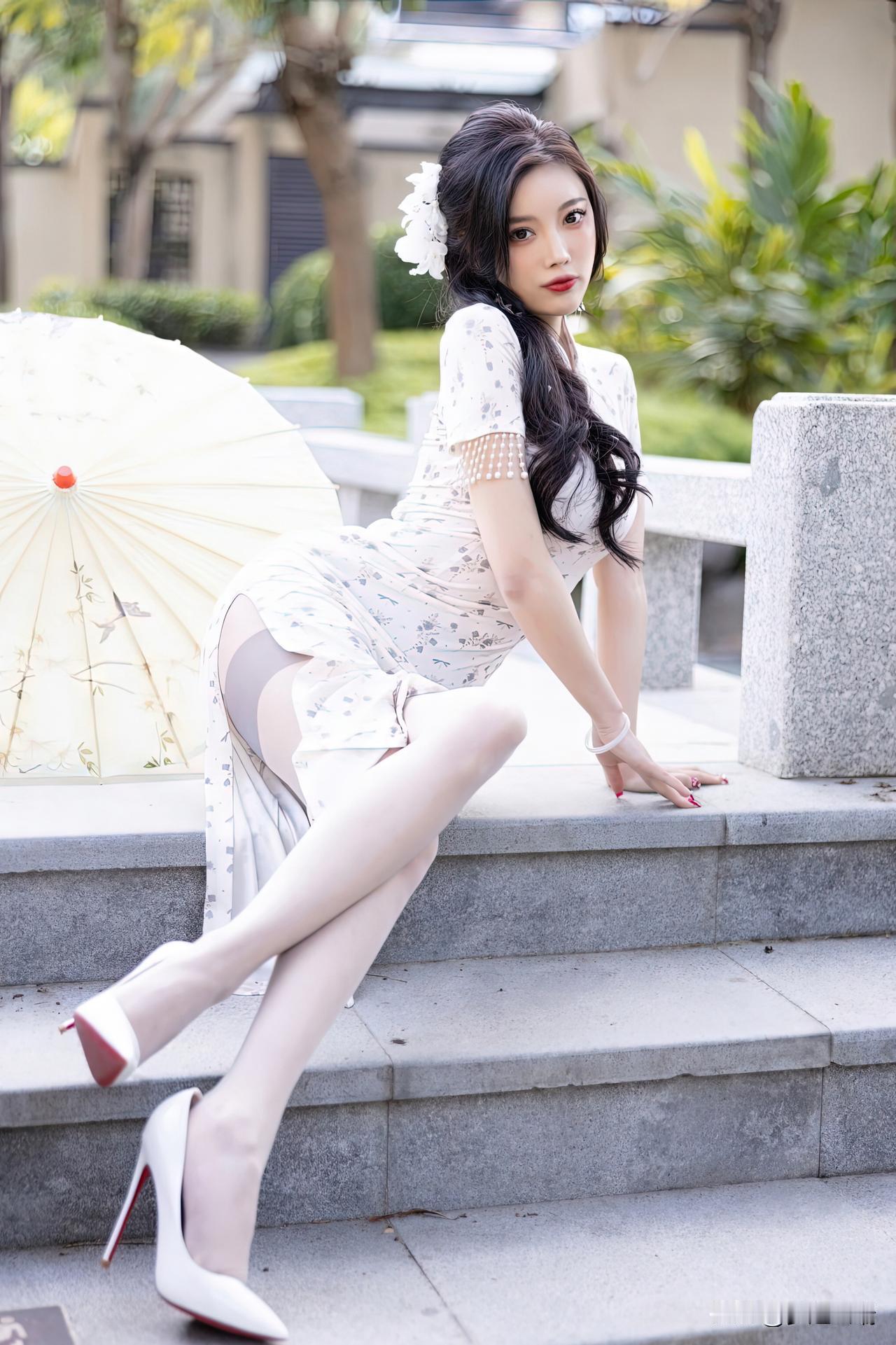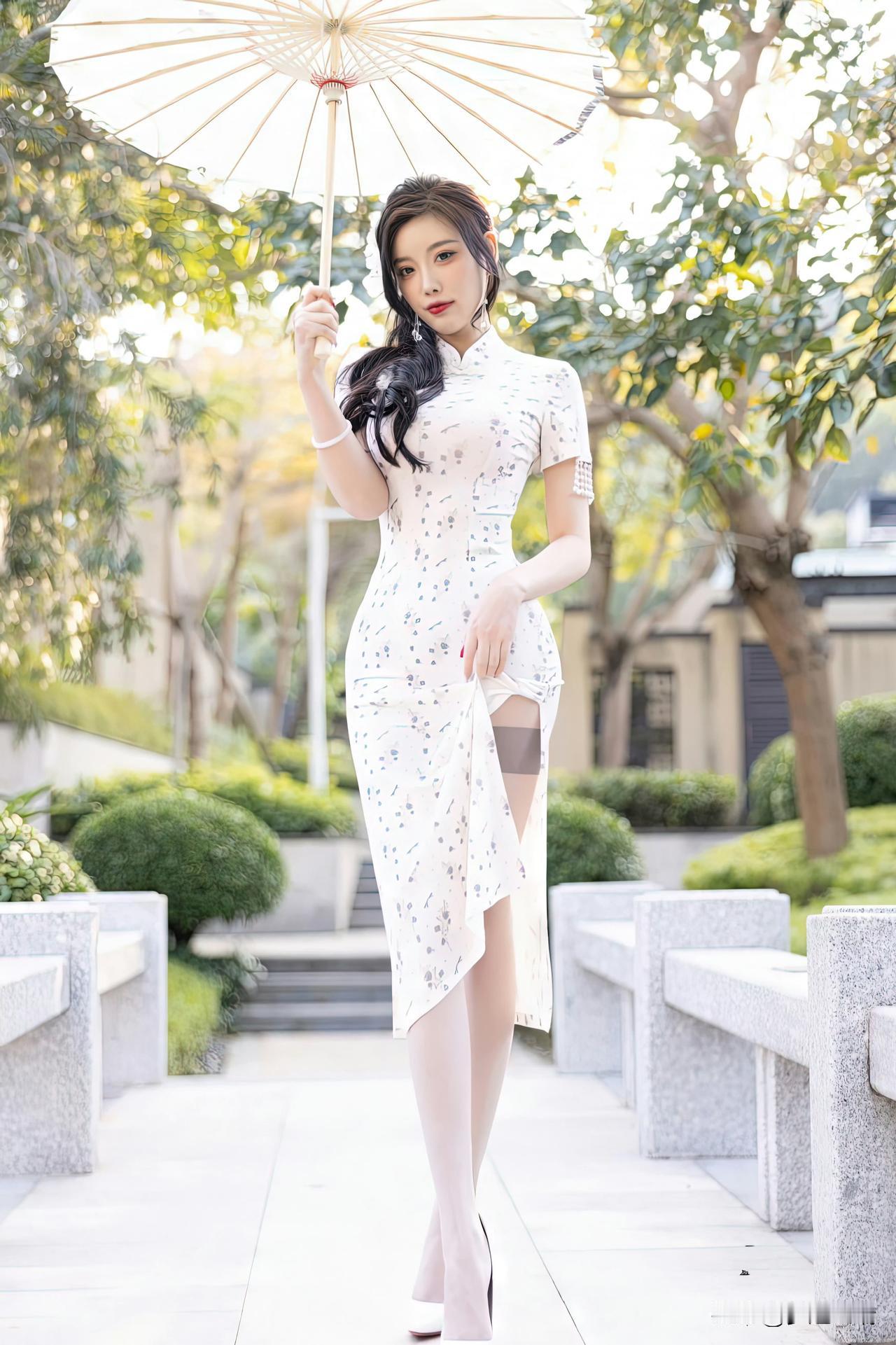 优雅复古风,白裙与伞的完美搭配,尽显东方韵味。