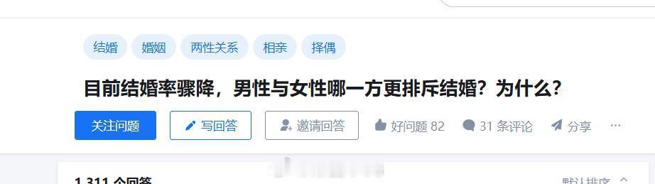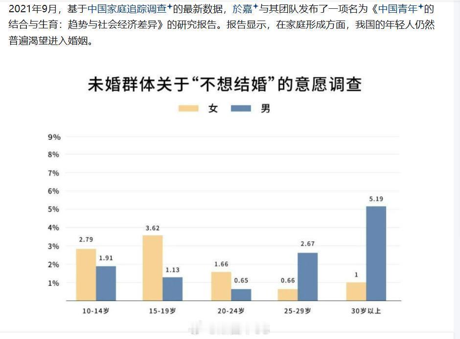 知乎上受邀回答一个问题:目前结婚率骤降,男性与女性哪一方更排斥结婚?那就用北大那个副教授於嘉与其团队2021年发布的研究报告,25岁以前,女性不想结婚的比例高,过了25岁,男性不想结婚远高于女性。至于为什么?自己想