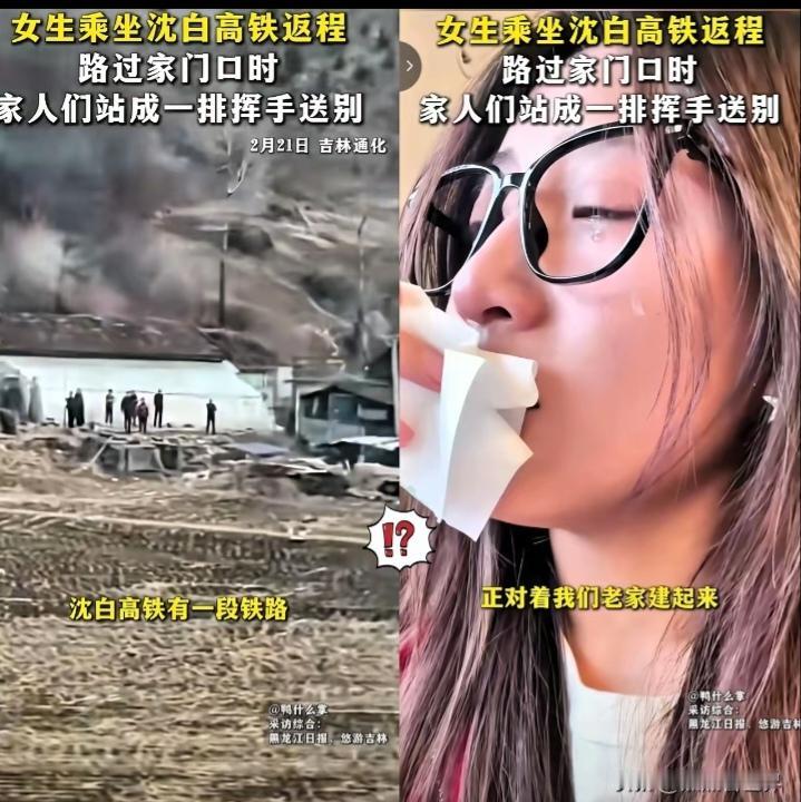 泪目!吉林通化,一名坐着高铁返程上班的女生,突然哭了。原因竟然是列车经过她家门口的时候,她看见爸妈,爷爷奶奶,弟弟妹妹都在田间地头上挥手! 这画面太美了,她没控制住自己的泪。之所以会看到这一幕,是因为她提前买了票,随口和家人说一声,哪趟列车会经过村子。没想到家人竟然特意等在那儿。 这个视频也上传到网上了,很多网友看了都很有感触,都开始纷纷讲自己的故事:是啊,家才是心灵的港湾。说起来平淡无奇,却藏着父母对孩子永远的牵挂。不论我们走到哪里,爸妈永远都是我们最坚强的后盾。 回家过年的时候满心都是欢喜,盼着见家人、吃团圆饭,可真要离开家去上班,心里满是舍不得,走一步回头看三步。家人的爱从来都不张扬,就这么站在田埂上挥挥手,藏着最深的惦记。在外打拼的人都懂这份心情,离别虽难,可家里的这份温暖,永远是我们往前走的力量。 各位读者你们怎么看?欢迎在评论区讨论。