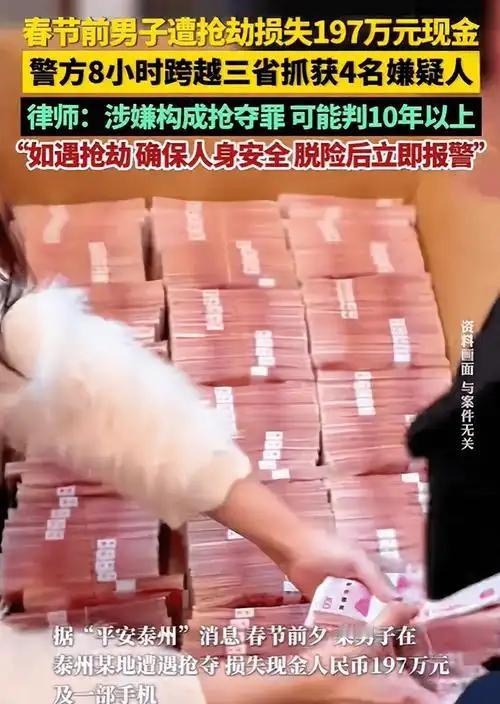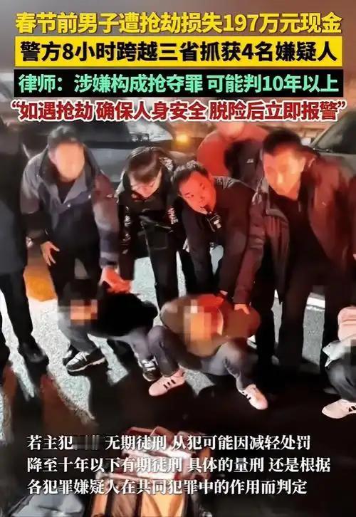 197万现金街头遭抢 泰州警方八小时跨三省擒贼追赃 (个人观点仅供参考,无任何不良引导) 谁能料到光天化日之下竟有人敢铤而走险抢夺巨额现金,谁又能想到逃窜三省的嫌疑人转眼就落入法网。多行不义必自毙,这起发生在江苏泰州的抢夺案件,以雷霆破案之势击碎了犯罪分子的侥幸心理,也让百姓真切感受到公安力量的硬核守护。 岁末年初本是阖家团圆的温馨时刻,江苏泰州海陵区街头却突发惊险一幕。一名群众携带197万元现金准备办理业务,四名心怀不轨的嫌疑人伺机作案,当场抢走现金与手机。百万巨款关乎群众切身利益,分毫损失都将带来沉重打击,泰州公安海陵分局接警之后即刻行动,全员进入紧急作战状态。 现场线索快速梳理,监控画面细致排查,嫌疑人身份与逃窜路线迅速浮出水面。四名嫌疑人得手之后驾车逃离泰州,一路经由安徽向江西方向逃窜,企图依靠跨省流窜逃避法律惩处。现代警务机制高效运转,三省公安力量无缝衔接协同作战,一张无形的追捕大网悄然铺开。 追捕民警昼夜兼程不敢懈怠,一路紧盯车辆轨迹精准追击,饿了简单充饥渴了就地饮水,全程保持高度专注紧盯目标。八个小时的极速追击跨越三省地域,民警们用速度与责任守护群众财产,在江西境内高速收费站成功截停嫌疑车辆。四名嫌疑人尚未反应便被悉数控制,束手就擒再无逃窜可能。 被抢的197万元现金完整追回,涉案手机一并找回,人赃并获的圆满结局守护了群众的合法权益。快速破案的背后是公安民警的专业素养与责任担当,是跨区域协作的强大合力,更是对违法犯罪零容忍的坚定态度。法网恢恢疏而不漏,任何妄图侵害群众财产的行为,都终将难逃法律的严惩。 此次案件也为广大群众敲响安全警钟,日常出行切勿携带大额现金,做好自身财产安全防护。泰州警方用实际行动践行守护承诺,以快制快重拳出击,坚决守护百姓平安与社会安宁,用硬核实力筑牢安全防线。
