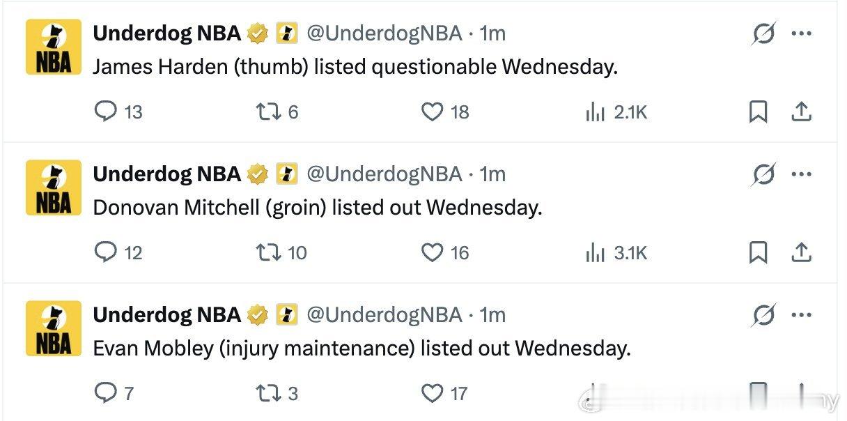 今日对阵雄鹿:米切尔缺席(腹股沟)莫布利缺席(伤病管理)哈登出战成疑(拇指骨折)