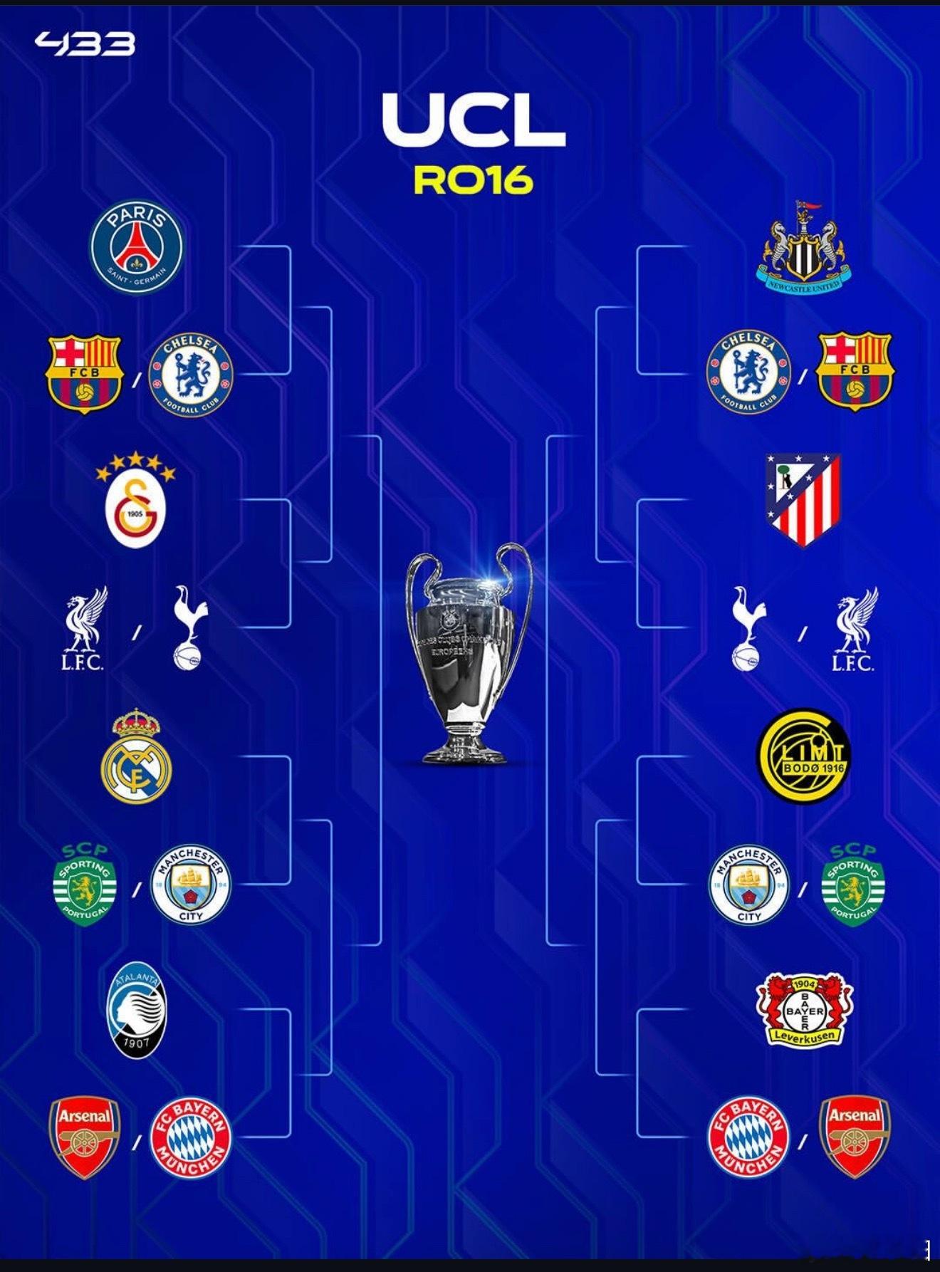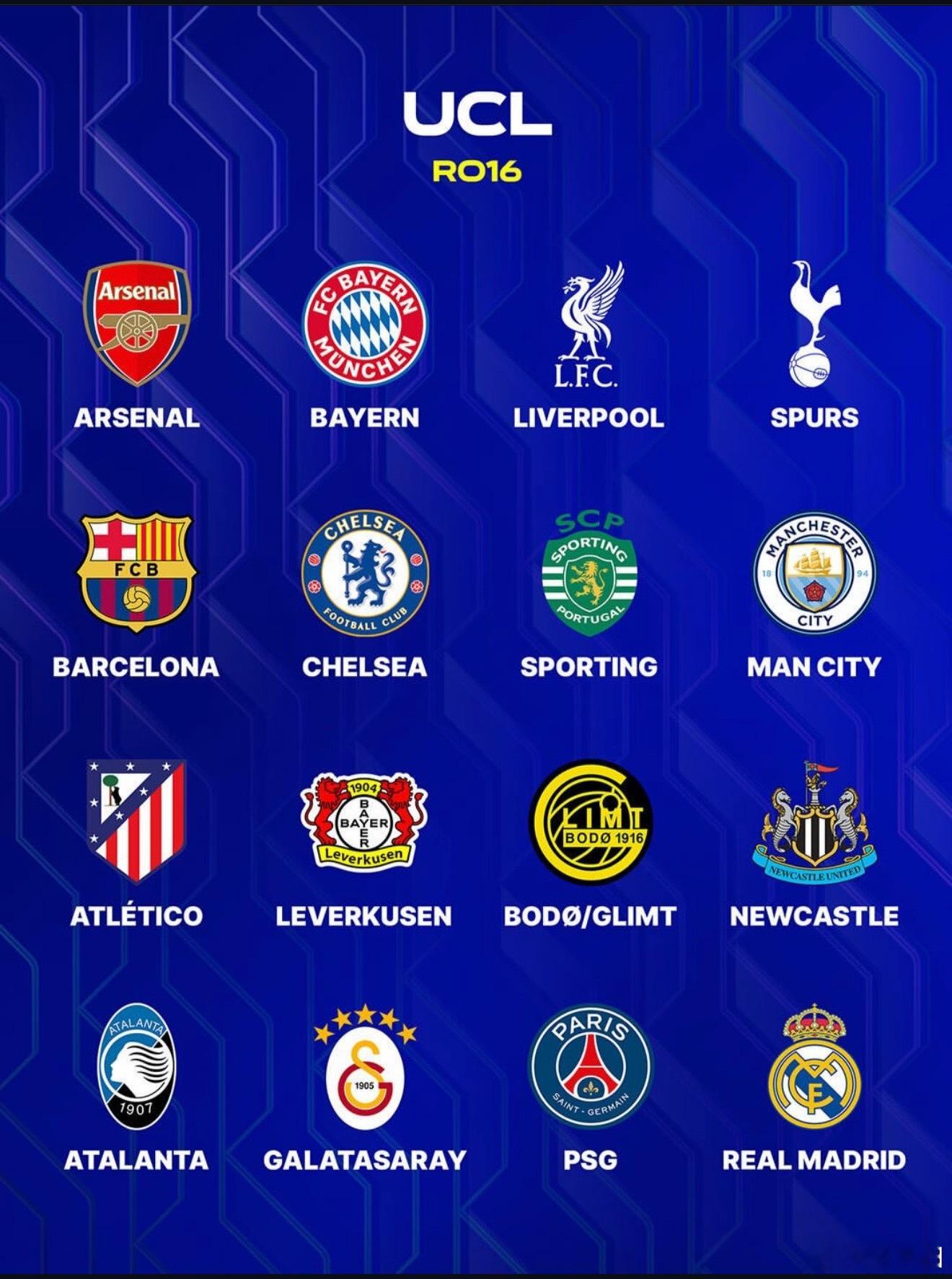 通过附加赛晋级的 8队:马德里竞技、勒沃库森、纽卡斯尔、博德闪耀、皇马、大巴黎、亚特兰大、加拉塔萨雷。皇马2比1本菲卡亚特兰大4比1多特蒙德