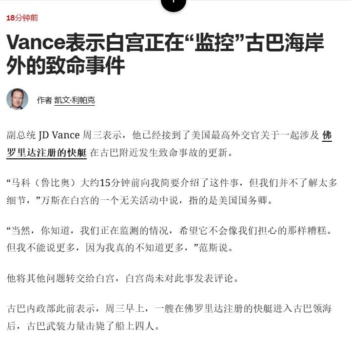 突发!一艘在美国佛罗里达州注册的快艇违规闯入古巴领海,双方发生交火,美方4人被打死、6人受伤。 当地时间2月25日,古巴方面表示,是美方快艇率先开枪打伤古方人员随即双方交火;而美国国务卿鲁比奥则迅速撇清,称他们不知道是谁控制了这艘船,也没有美国政府人员参与其中! 但是,美国副总统万斯却表示,白宫正密切关注在美注册快艇在古巴附近“遭枪击”事件;美国佛罗里达州总检察长乌特迈尔也表示,其已指示全州检察办公室与联邦、州及执法伙伴合作,就古巴领海船只交火事件启动调查。 所以,几个问题接踵而至: 1、美方快艇为什么会闯进古巴领海?有意还是无意?为什么他们率先向古方人员开火? 2、美国为什么要迅速撇清美国政府人员未参与这次强闯古巴领海事件? 3、这是否会成为美国对古巴开展军事行动的一个导火索? 4、美军正在中东大规模集结,古巴领海交火事件会让中东局势产生变化吗? 局势一触即发!