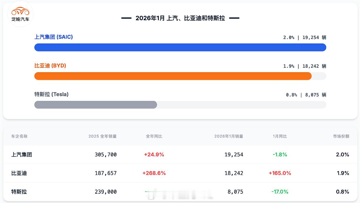 ◎ 2025 年全年,上汽集团销量 30.57 万台,同比增长 24.9%;2026 年 1 月销量 1.93 万台,同比下降 1.8%,市场份额 2.0%。