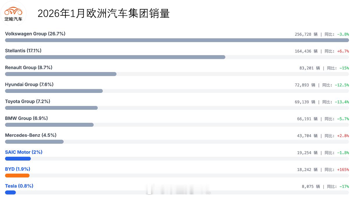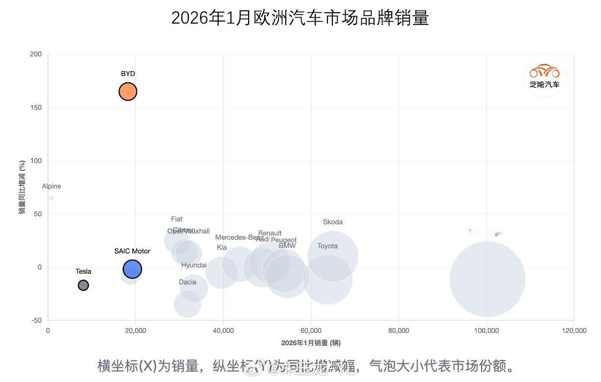欧洲2026年1月汽车销量解析,上汽、比亚迪超过特斯拉我们感兴趣的是比亚迪、上汽和特斯拉的销量比较,我们可以跟踪这个数据: